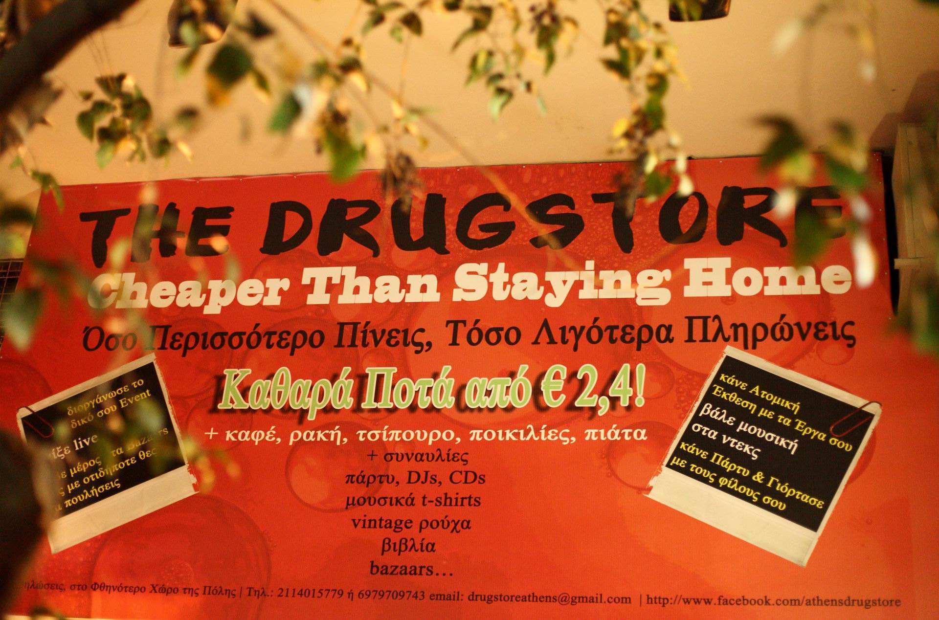 Το επόμενο πρωί, ευτυχώς, δεν με βρήκε με hangover αλλά με λεφτά στην τσέπη, γιατί η έξοδος δεν είναι «έξοδο». Πρόκειται λοιπόν αδιαμφισβήτητα για το καινούριο στέκι του κέντρου, στο οποίο μπορεί ο καθένας να πιει και -σε αντίθεση με το όνομά του- οι τιμές του σίγουρα δεν είναι φαρμακείου. Περισσότερες πληροφορίες για τα DJ sets, events και συναυλίες: www.facebook.com/athensdrugstore