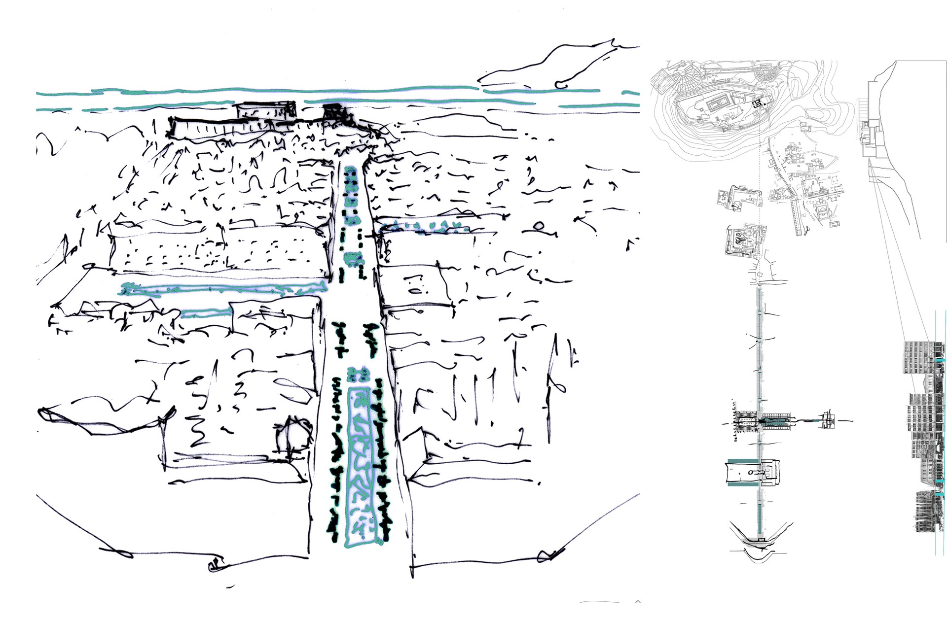 Σε μια αρχιτεκτονική προσέγγιση του θέματος του νερού μέσα στην πόλη της Αθήνας, το νερό θα όφειλε να αναδείξει μια καινούρια σχέση μέσα στην μάζα του αστικού ιστού. Με αυτή την οπτική το νερό επιλέγεται ως το αρχιτεκτονικό υλικό για να εγκαταστήσει τρόπο τινά ένα Land-Art μέσα στον αστικό ιστό ενώ ταυτόχρονα οργανώνει και αποδίδει νέες ποιότητες στους χώρους που οριοθετεί.