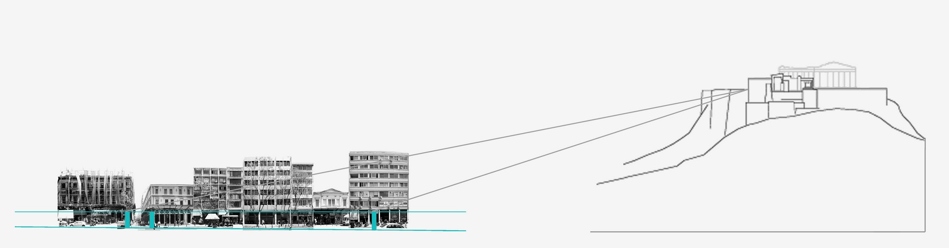 Η επιλογή αυτή εγκαινιάζει τρεις ταυτόχρονες νέες σχέσεις μέσα στην πόλη: Αναδεικνύει μια νέα κλίμακα μέσα στον ιστό χωρίζοντας τον άξονα της οδού Αθηνάς σε επιμέρους αστικά κενά που λειτουργούν εν είδει αστικών δωματίων. Επαναφέρει το μέτρο της φυσικής γεωγραφίας πάνω στον αστικό άξονα που συνδέει την πλατεία Ομόνοιας με αυτή του Μοναστηρακίου καθώς το ύψος των τοιχίων μένει σταθερό ενώ η κλίση του δρόμου, λόγω της τοπογραφίας, αλλάζει. Ενισχύει τον οπτικό άξονα προς την ακρόπολη, μια υπερβατική κίνηση του βλέμματος μέσα στην πόλη.