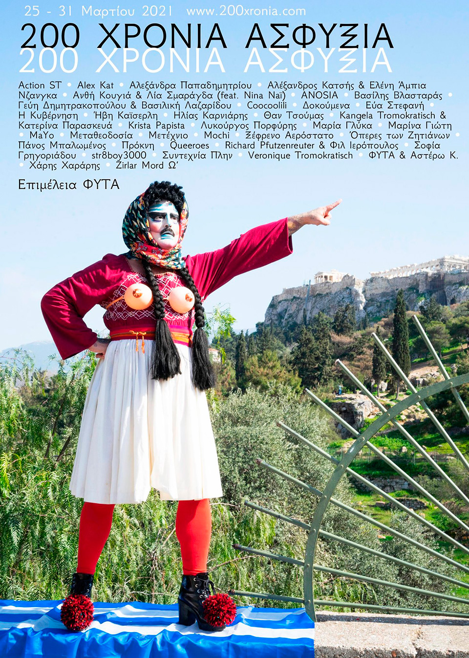 Η διαδικτυακή έκθεση «200 Χρόνια Ασφυξία» φτιάχτηκε από υποκείμενα και μιλάει για υποκείμενα που ασφυκτιούν μέσα στο πλαίσιο της ελληνορθόδοξης πατριωτικής κυριαρχίας και χρησιμοποιούν δημιουργικά μέσα για να εκφράσουν τη δυσφορία τους απέναντι σε μια μυθολογία που δεν τα συμπεριλαμβάνει, δεν τα εκφράζει, δεν τα αφορά.