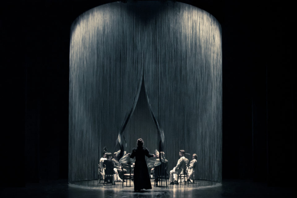 Ενας κύκλος που ερχόταν από ψηλά, με μια διάφανη κουρτίνα που χάραζε την περίμετρό του και δέκα καρέκλες εντός του (σκηνικά Ευαγγελία Θεριανού) ήταν το σύμπαν στη σκηνή. Κάθε ζευγάρι έπαιρνε τις καρέκλες του, έβγαινε εκτός κύκλου, ακολουθούσε η σκηνή του (που πάντα κατέληγε σε ερωτική συνέρευση, πάντα υπό τους ήχους του Στράους) και μετά, το ένα από τα δύο μέλη του προηγούμενου ζευγαριού συναντούσε τον επόμενο: τον εραστή ή την ερωμένη, το αντικείμενο του πόθου, το πλάσμα που επιθυμούσε να κατακτήσει ανεβάζοντας τον αύξοντα αριθμών των ερωτικών συντρόφων ή περνώντας απλώς την ώρα του. Το άλλο μέλος του προηγουμενου ζευγαριού έστεκε με την καρέκλα του σε μια άκρη της σκηνικής δρασης. Οσοι έμεναν εκτός κύκλου ή όσοι ακόμα παρέμεναν εντός του, σχολίαζαν το ζευγάρι της κάθε σκηνής με χιούμορ, άλλοτε συμπληρωματικό των διαλόγων, άλλοτε καυστικό, δημιουργώντας μια περίεργη συνέργεια.