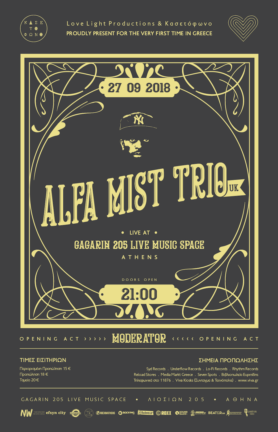 Ο Alfa Mist εμφανίζεται τη Πέμπτη 27 Σεπτεμβρίου στο Gagarin 205 της Αθήνας και την Παρασκευή 28 Σεπτεμβρίου στο Club του Μύλου στη Θεσσαλονίκη.