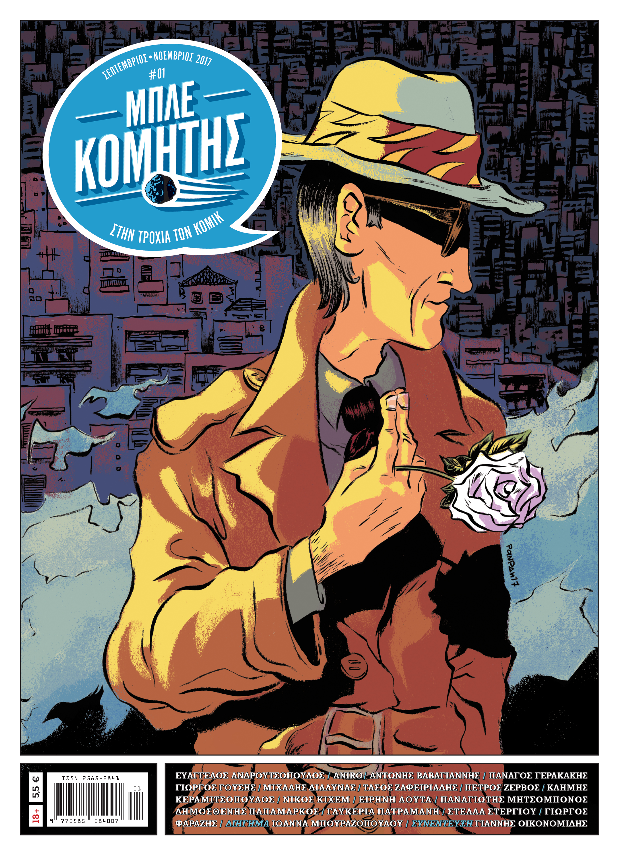 Έτσι, με ένα γρήγορο ξεφύλλισμα του πρώτου τεύχους, θα βρει κανείς νέα από τον χώρο των κόμικ αλλά και ένα διήγημα της Ιωάννα Μπουραζοπούλου εικονογραφημένο από τον Δημήτρη Καμένο. «Γενικά, ψάχνουμε ανθρώπους που είναι αφηγητές με κάθε μέσο. Θέλαμε οπωσδήποτε να έχει ένα διήγημα αλλά να μην θεωρείται παραπαίδι του ίδιου του περιοδικού ή μέρος της παραλογοτεχνίας. Προσπαθούμε να βρίσκουμε μεγάλα ονόματα πεζογράφων που έχουν μία άλλη ελευθερία λόγω της φύσης του περιοδικού. Στο επόμενο θα έχουμε αστυνομικό από τον Κώστα Μουζουράκη, θα είναι ένα επαρχιακό noir» εξηγεί ο αρχισυντάκτης του Μπλε Κομήτη. Και κάπως έτσι, με τον διάλογο που ανοίγει το περιοδικό με τις άλλες τέχνες, το πρώτο τεύχος φιλοξενεί και μία συνέντευξη με τον σκηνοθέτη Γιάννη Οικονομίδη -κάτι που δεν μας κάνει καθόλου εντύπωση μιας και το σινεμά του Οικονομίδη μοιράζεται πολλά αφηγηματικά και αισθητικά στοιχεία με ένα κόμικ.