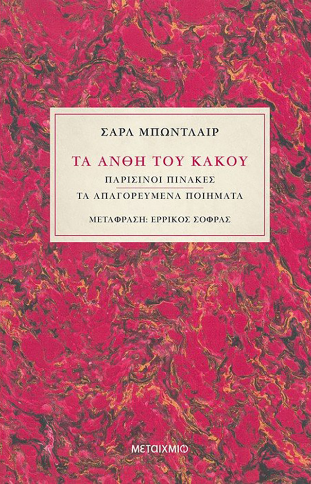 Όσο για τα «Άνθη του κακού – Παρισινοί πίνακες- τα απαγορευμένα ποιήματα» σε ικανή μετάφραση του Ερρίκου Σοφρά, είναι μία ιδιαίτερα κομψή, δίγλωσση έκδοση που περιλαμβάνει όλες εκείνες τις ποιητικές συνθέσεις (οι περισσότερες με τολμηρό ερωτικό περιεχόμενο) που είχαν αποκλειστεί αρχικά – επειδή σκανδάλιζαν τα «χρηστά ήθη» της εποχής. Και μας προσφέρει απλόχερα, μερικά από τα πιο ευφάνταστα, παράξενα και επικίνδυνα γοητευτικά άνθη του κακού…