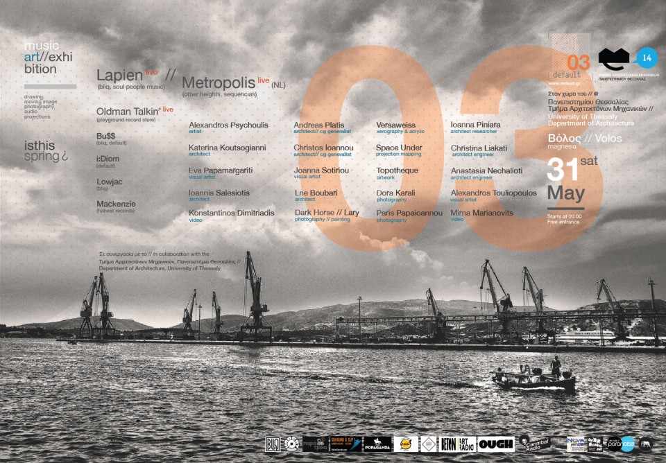 H κολεκτίβα default, δημιούργημα 2 αρχιτεκτόνων και του ιδιοκτήτη της δισκογραφικής Bliq records, μετά το επιτυχημένο event Back in the city? το Φεβρουάριο στο Ρομάντσο, επιστρέφει, στο Βόλο αυτή τη φορά, το Σάββατο 31 Μαΐου σε συνεργασία με το τμήμα Αρχιτεκτονικής του Πανεπιστημίου Θεσσαλίας.