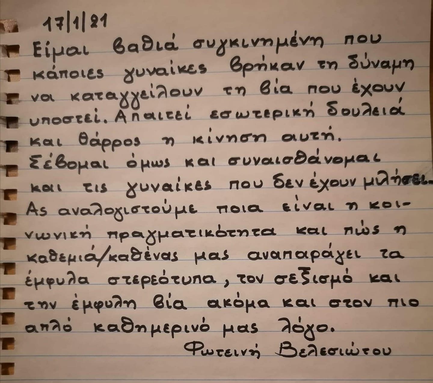 Η Φωτεινή για την οποία μπορεί να μην ξέρουμε πολλά, αλλά τη νιώθουμε τόσο δίπλα μας. Η Φωτεινή που στις 7 Μαρτίου, μετά τον ξυλοδαρμό πολίτη από αστυνομικό στη Νέα Σμύρνη, έγραφε στο τετράδιό της «Ως εδώ! Καμία ανοχή…» και 2 χρόνια μετά τη βάναυση δολοφονία του Ζακ Κωστόπουλου, της αγαπημένης Zackie Oh, σημείωνε «Ζητάμε να αποδοθεί δικαιοσύνη. Μάλλον η αλήθεια ενοχλεί πολύ», ενώ έχει τοποθετηθεί, μεταξύ άλλων, και για τη δίκη της Χρυσής Αυγής, για τον Παύλο Φύσσα και για το κίνημα #MeToo.
