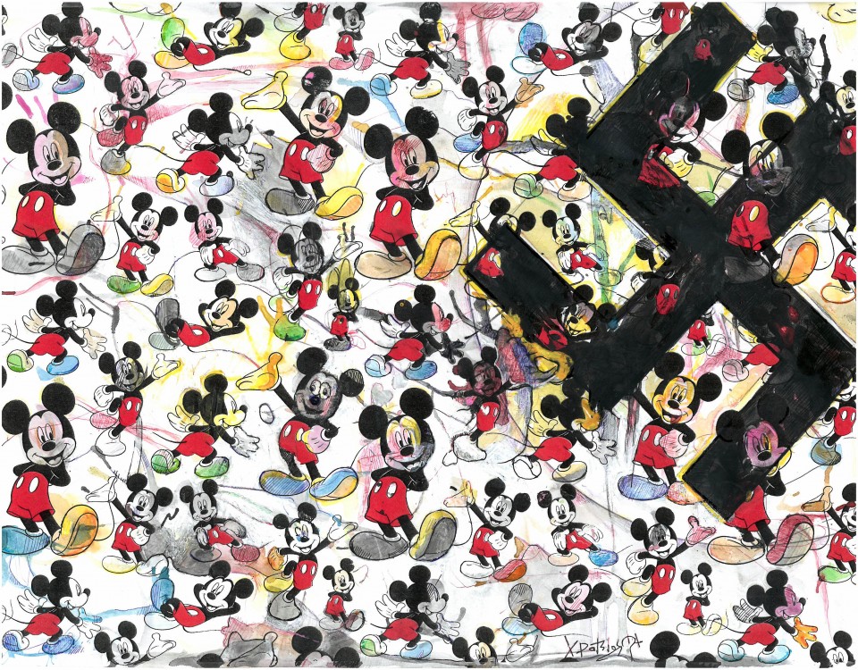 Είναι προφανές ότι ο Πάτσιος διατηρεί ατόφιες επιρροές τόσο από την εννοιολογική τέχνη, αφού οι καλλιτεχνικές του προτάσεις ανατρέπουν την εικόνα του παραδοσιακού έργου τέχνης, αλλά και από ρεύματα όπως ο εξπρεσιονισμός, ο αυτοματισμός και η pop art. H μεικτή τεχνική που χρησιμοποιεί πετυχαίνει απόλυτα την άρση μεταξύ των ορίων των εκφραστικών μέσων και συνοδεύεται από το χαρακτηριστικό γνώριμο χιουμοριστικό ύφος του Πάτσιου, προσδίδοντας μια φρέσκια πνοή στα πολλαπλά μηνύματα και στους συμβολισμούς του. Ο ήρωας του Disney ο Mickey, για παράδειγμα, παρόν στο έργο με τίτλο «Le temps perdu» σε πολλαπλούς χαμογελαστούς κλώνους, συνυπάρχει με μια μαύρη σβάστικα– αναμφισβήτητο σκοτεινό σύμβολο των καιρών- σε μια σχεδόν σουρεαλιστική σύνθεση, που «βγάζει γλώσσα» στην πολιτιστική και πολιτική κρίση που ζούμε. Λίγο πιο πέρα, στον πίνακα με τίτλο «The watergate», επιχειρείται μια ουσιαστικότερη σύλληψη της πραγματικότητας, αυτής που κρύβεται πέρα και πίσω από την επιφάνεια των πραγμάτων, με ένα μαύρο τράγο – εξιλαστήριο θύμα στο βωμό μιας στρεβλωτικής κοινωνίας συνώνυμης με το no man’s land. Κυριαρχεί το όργανο θυσίας: ένα ξίφος βυθισμένο στο κόκκινο και στο μαύρο, ενώ ως ανεξέλεγκτη χιουμοριστική πινελιά, προβάλλει ο φιόγκος- papillon τυλιγμένος στο λαιμό του ζώου. Έντονα χρώματα και πολυδιάστατη γλώσσα, η οποία διαμορφώνει καθοριστικά τα έργα – υβρίδια, κυριαρχούν σε μια εξαιρετικά επίκαιρη έκθεση, υπό την προσεχτική επιμέλεια της Blender Gallery, με το element of surprise να καραδοκεί σε κάθε γωνία.