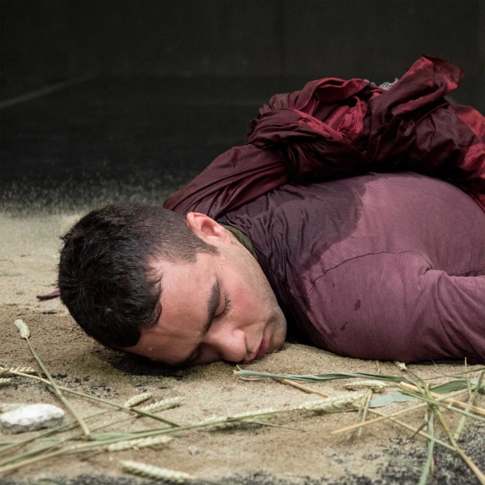 Η Κεντρική Σκηνή της Στέγης ήταν σχεδόν άδεια από σκηνικά. Μόνο μερικά στάχυα, μερικές πέτρες, λίγη άμμος, ό,τι υπάρχει σε μια οποιαδήποτε ακτή, σε μια οποιαδήποτε γη που φτάνει κάποιος. Και δίπλα τους ένα άνθρωπος ξεβρασμένος, αποκαμωμένος, μόνος, που προσπαθεί να στήσει τη νέα στέγη του. Από την αρχή. Με στάχυα, με πέτρες, με άμμο και νερό. «Μ’ έκανες πρόσφυγα. Τώρα κάθε στιγμή, κάθε ώρα, κάθε μέρα, θα πεθαίνω», διαβάζουμε στη χάρτινη κουρτίνα στο βάθος της σκηνής, που γίνεται και οθόνη προβολής στιγμών της ιστορίας στη διάρκεια της παράστασης. Και μετά βλέπουμε στην οθόνη έναν πατέρα με το μωρό του, κάπου ξεβρασμένους, νεκρούς. Και η ιστορία συνεχίζεται. Είτε με λέξεις που διαβάζουμε στη μεγάλη οθόνη απέναντί μας, είτε ακούγεται από μια φωνή (voice off), που θυμίζει αφήγηση βιβλικής ιστορίας.