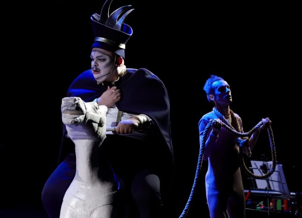 Δεύτερον υπήρχε η κίνηση και η χορογραφία που επιμελήθηκε η Πατρίτσια Απέργη και απέδωσαν με άψογη ακρίβεια όλοι οι ηθοποιοί, κίνηση που μαζί με τα ιδιαίτερα και έξυπνα κοστούμια της Βασιλικής Σύρμα έδιναν την εντύπωση ενός μεγάλου παιδικού παιχνιδιού και μιας κουρδισμένης, αλλά ξεκαρδιστικής κίνησης που παρέπεμπε σε μια παρέα κλόουν. Αλλά κι αυτά τα δύο θα ήταν μισά αν δεν υπήρχε η μουσική σύνθεση του Γιώργου Πούλιου, με τρεις μουσικούς επί σκηνής, που δεν ήταν απλώς μουσικοί αλλά παραγωγοί ήχων από ό,τι μπορεί να φανταστεί κανείς. Ηχων που μαζί με την κίνηση και τα κοστούμια -βασικά συστατικά της εικόνας και της αίσθησης της παράστασης- επέτειναν, με σωστές δόσεις και με φαντασία, το φαρσικό στοιχείο.