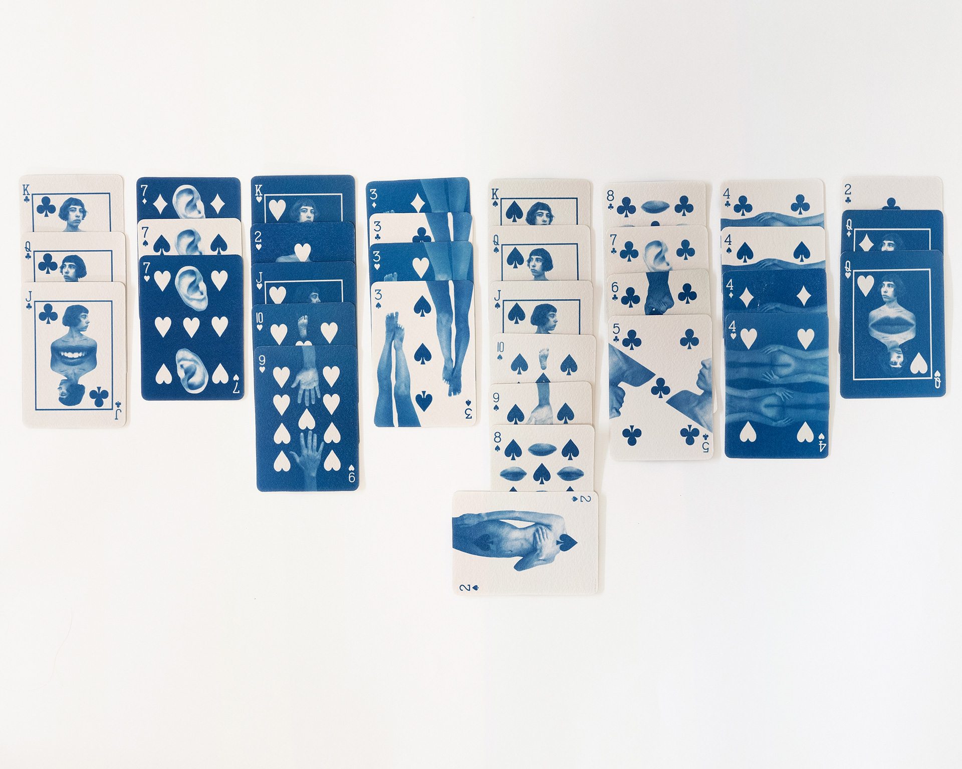 Για την δημιουργία των εκτυπώσεων, χρησιμοποιώ τόσο ψηφιακά όσο και αναλογικά μέσα. Τα αυτο-πορτρέτα γίνονται με ψηφιακά μέσα. Τα αρνητικά, που θα εκτυπωθούν μετά αναλογικά στο χαρτί της τράπουλας, επίσης δημιουργούνται και τυπώνονται ψηφιακά στον εκτυπωτή του σπιτιού μου. Από εκεί και πέρα, η μέθοδος γίνεται αποκλειστικά αναλογική. Τόσο η χρήση της κυανοτυπίας, ως εκτύπωση του αρνητικού πάνω στο τραπουλόχαρτο, όσο και η κοπή κάθε ενός φύλλου χαρτιού της τράπουλας, γίνεται στο χέρι. Στη συγκεκριμένη ενότητα, πειραματίστηκα αρκετά με την υφή και το βάρος του χαρτιού, ώστε η τελική εκτύπωση να μπορεί να κρατάει το σχήμα της ακόμα και μετά από πολλά παιχνίδια.