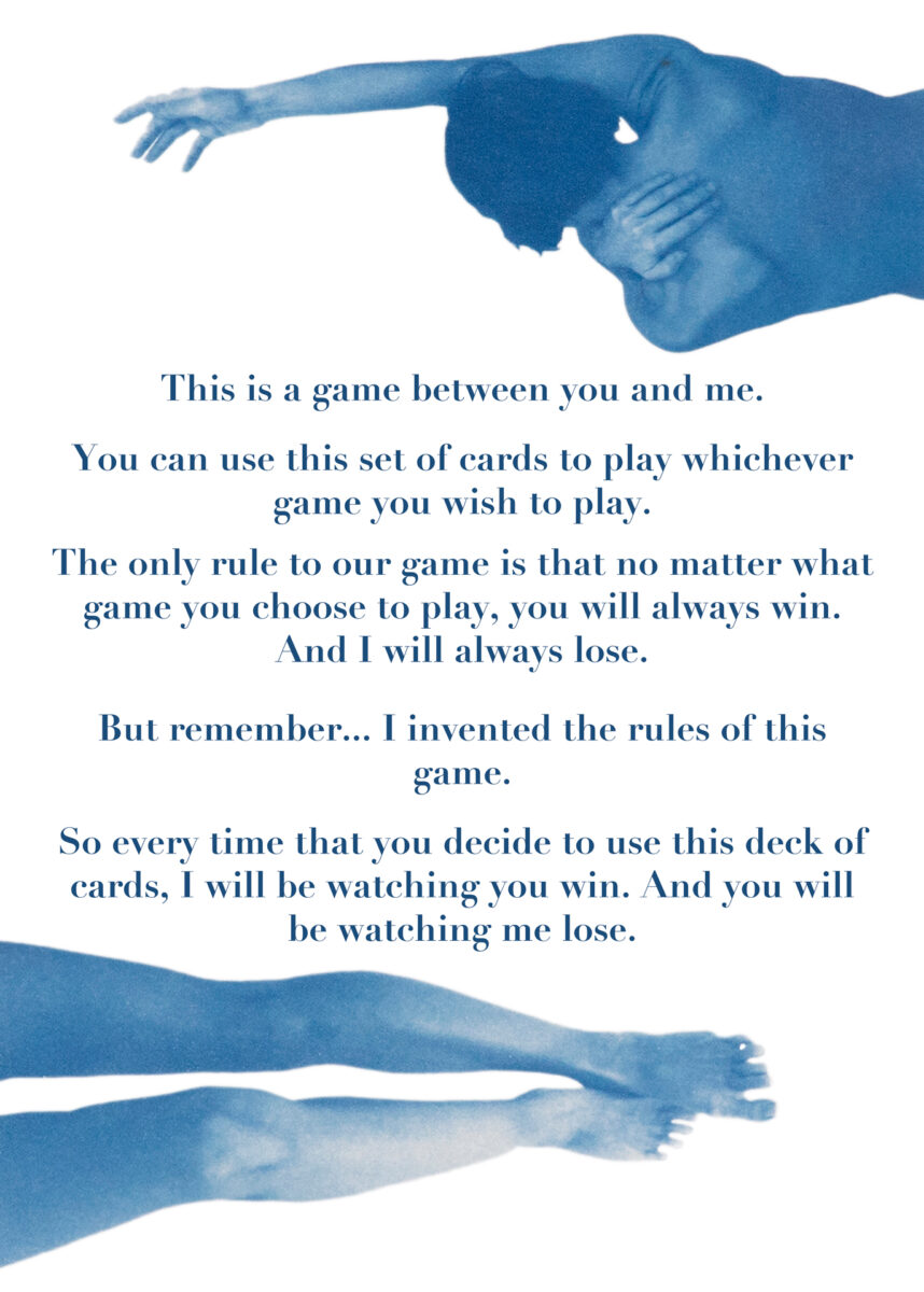 Χειροποίητα τραπουλόχαρτα, πάνω στα οποία τεμαχισμένα αυτο-πορτρέτα έχουν εκτυπωθεί με την παραδοσιακή μέθοδο της κυανοτυπίας, μοιράζονται ανάμεσα στους ανυποψίαστους θεατές, καλώντας τους να παίξουν ένα φαινομενικά αθώο παιχνίδι, αλλά ουσιαστικά να αλληλεπιδράσουν στο μεταφορικό παιχνίδι εξουσίας που υποβόσκει, σχεδόν πάντα, στις διαπροσωπικές μας σχέσεις. Έννοιες όπως αυτές του αυτο-σαμποτάζ, της αυτο-λύπησης και της αυτο-θυματοποίησης, μέσα από τις τεμαχισμένες εικόνες του σώματος της δημιουργού, διεκδικούν την αναγνώριση της δύναμης του ρόλου τους στην ψυχολογία του χαμένου, στον αντίκτυπο της εθελούσιας ήττας του.