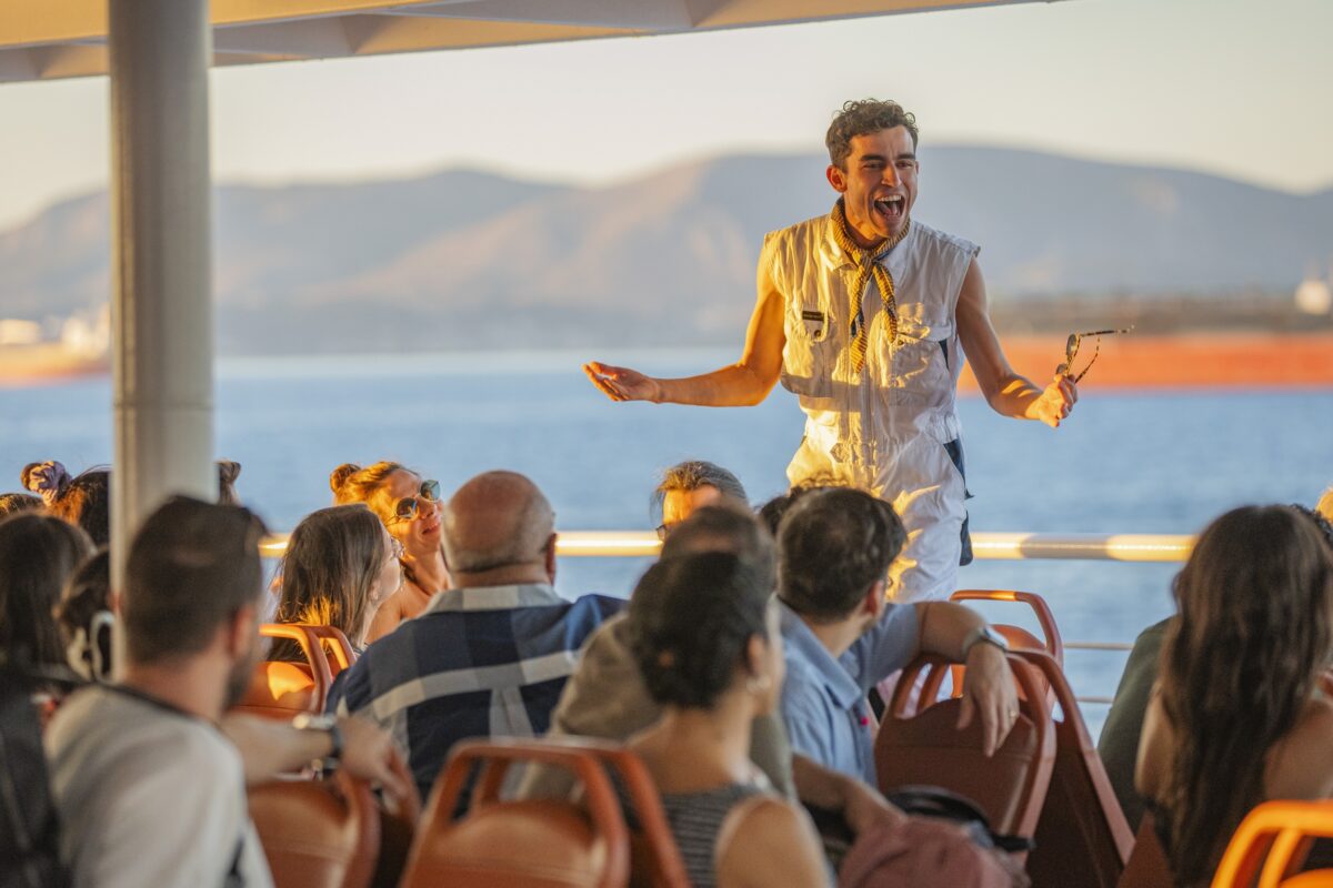 Η διαδρομή ξεκινούσε από το λιμάνι του Πειραιά στις 6.00. Ήμασταν εκεί στην ώρα μας, μαζί με τους εκατό τυχερούς που είχαν προλάβει το μαγικό χαρτάκι. Ένα team ανθρώπων -αποδεικνύονται ηθοποιοί- μας καθοδηγεί και μας βάζει στις αναπαυτικές καρέκλες. Σε λίγο θα δώσουν το σύνθημα. Μοιράζουν χαρτιά για bingo – δεν ξέρω γιατί, αλλά σκέφτομαι τον Σπύρο που βλέπει όλη την ώρα Golden Girls. Εμείς παίζουμε, εκείνοι χορεύουν και τραγουδούν στο ρυθμό του τηλεοπτικού Love Boat. Έτσι χαλαρώνουμε. Και γελάμε, όπως ακουμπάμε τυχαία ο ένας τον άλλο – τον άγνωστο άλλο. Όταν κάποιοι κερδίζουν (δεν ήμουν σε αυτούς), μας χωρίζουν σε ομάδες. Αν είσαι του ροζ ανεβαίνεις στο δεξί κατάστρωμα. Αν είσαι του γαλάζιου, στο αριστερό. Εγώ ήμουν του ροζ.