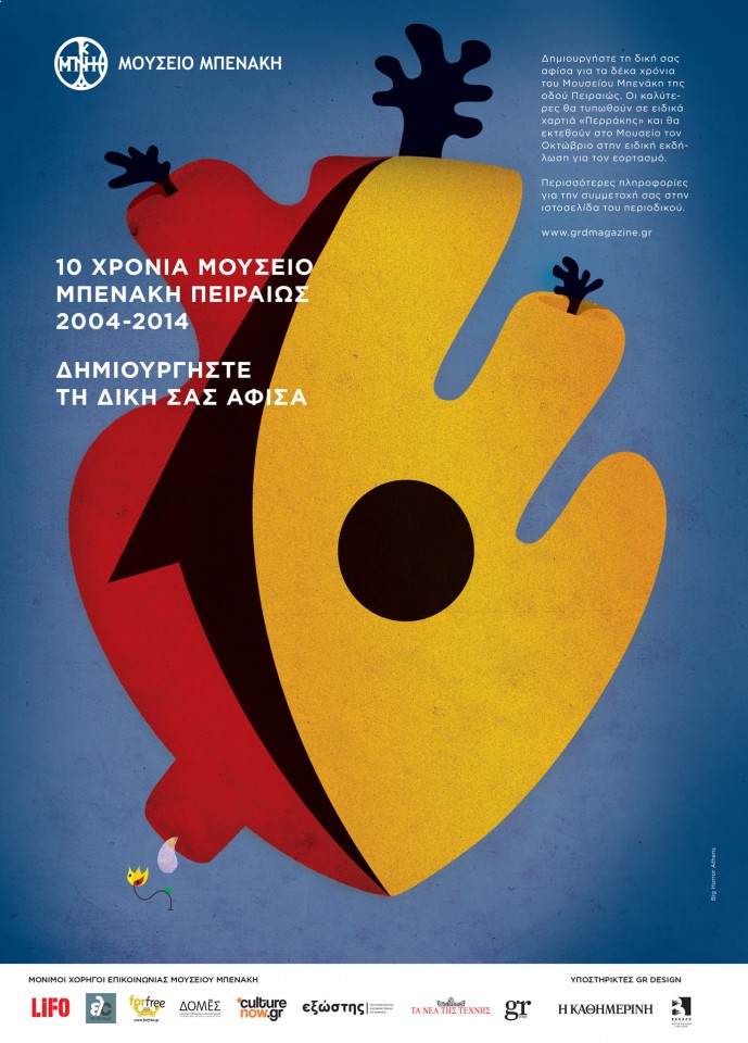 Το περιοδικό GRdesign λοιπόν μαζί με το Μουσείο Μπενάκη γιορτάζει την πρώτη δεκαετία του κτηρίου, καλώντας δημιουργούς να μπουν σε αυτό το εορταστικό πνεύμα και να σχεδιάσουν τη δική τους αφίσα για τα δεκάχρονα. Μέχρι τις 15 Σεπτεμβρίου οι δημιουργοί θα μπορούν να ανεβάζουν τις προτάσεις τους και να αναθέτουν στην συντακτική ομάδα του περιοδίκου την επιλογή των καλύτερων συμμετοχών. Εκείνες θα τυπωθούν σε χαρτιά «Περράκης» και θα εκτεθούν τον Οκτώβριο στην ειδική εκδήλωση του Μουσείου Μπενάκη.