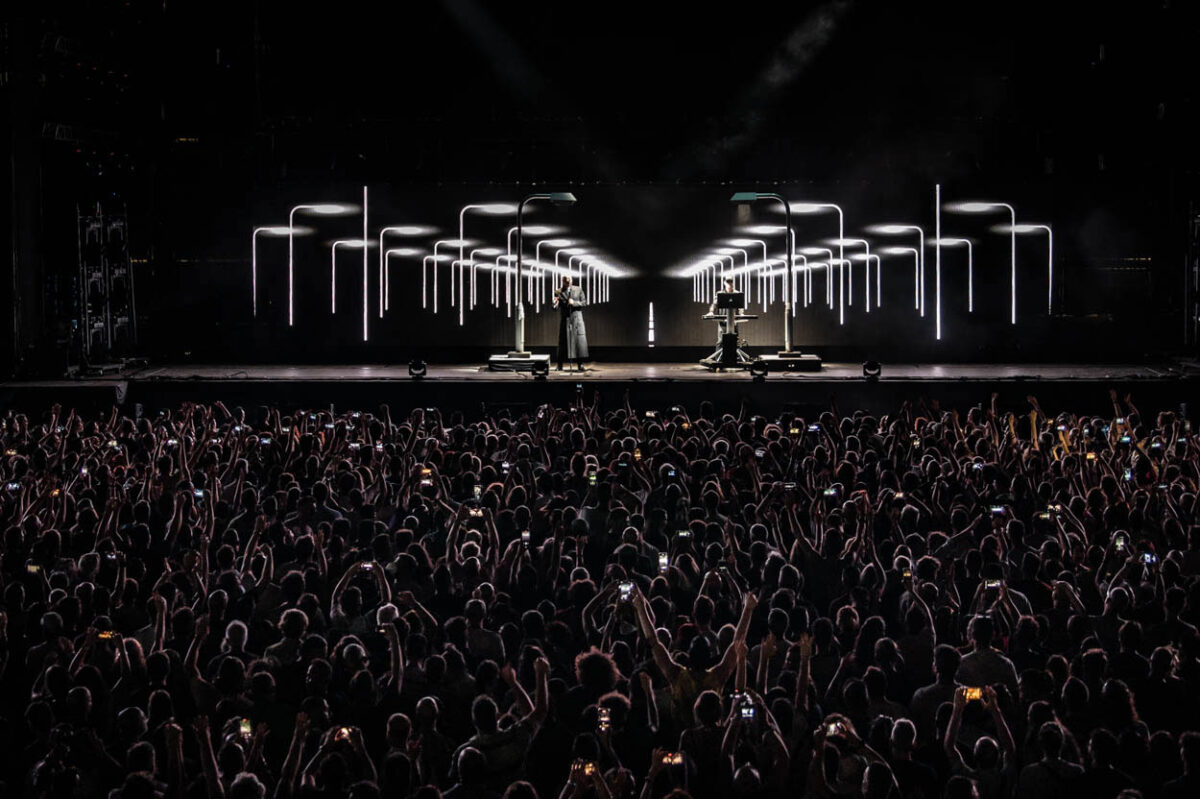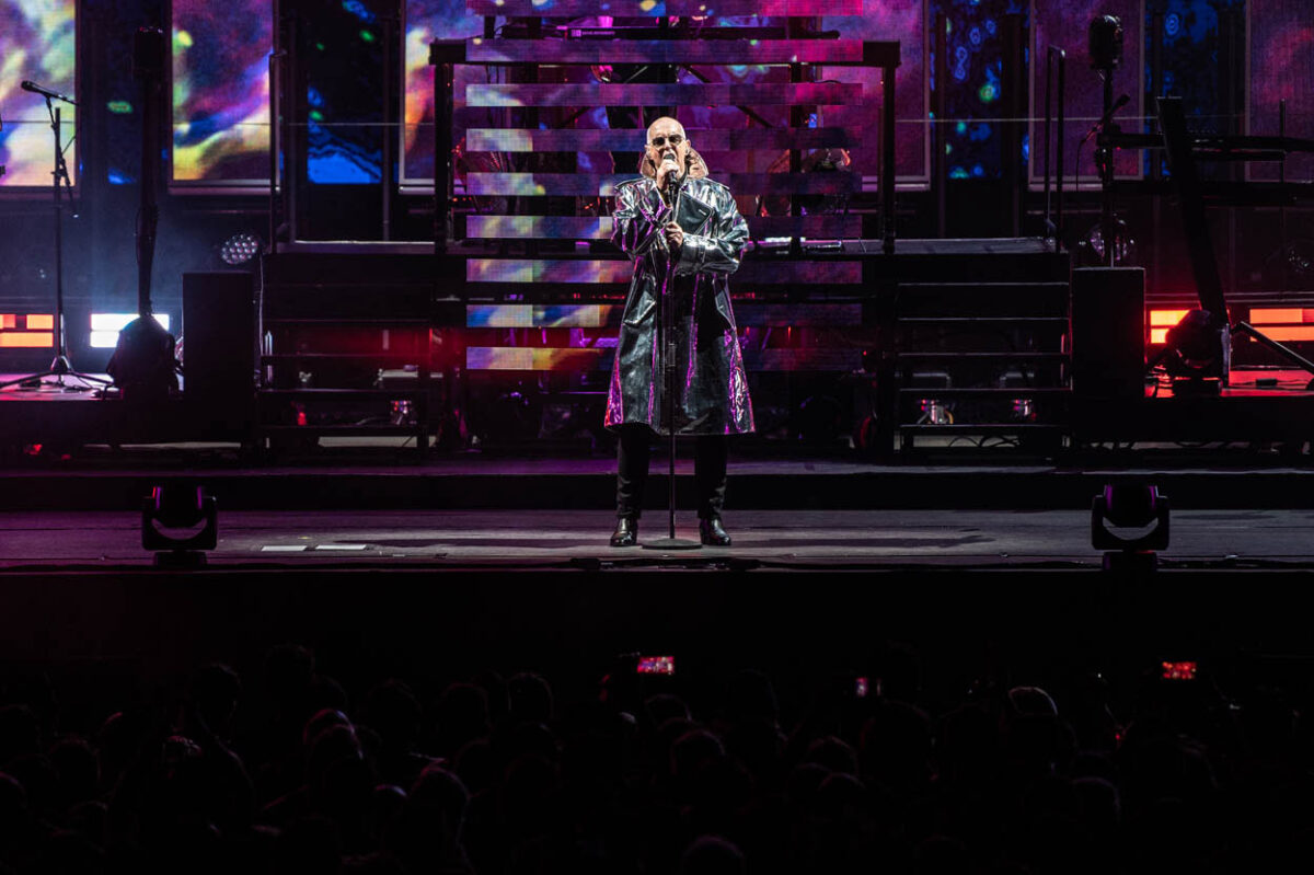 23:00. Είχα τη χαρά να κάνω face to face συνέντευξη στους Pet Shop Boys το 2009 στο Λονδίνο και με είχε κερδίσει η ζεστασιά τους, κάτι που σε συνδυασμό με όλες τις αναμνήσεις από τα εφηβικά μου χρόνια που οι μελωδίες τους ήταν πάντα σε κάποια mixtape, με κάνει να τους αγαπώ πολύ. Κάτι ακόμα που θαυμάζω σε αυτούς είναι το γεγονός ότι παίρνουν δημόσια πολιτική θέση. Άσχετα με το αν συμφωνώ πάντα 100% με αυτή τη θέση. Το ίδιο κάνουν και απόψε πριν βγουν στη σκηνή, ξεκινώντας τη συναυλία προβάλλοντας την ουκρανική σημαία στο τεράστιο video wall. Αμέσως μετά τα φώτα σβήνουν και μέσα σε λίγα δευτερόλεπτα ξεκινά ένα ντελίριο εικόνων πίσω τους και μπαίνουν με ένα από τα πιο αγαπημένα τους χιτ, το “Suburbia”.