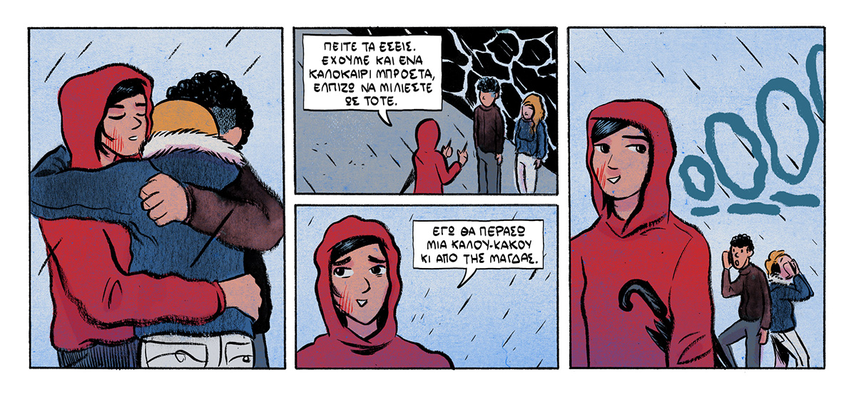 «Ευτυχώς έχω καταφέρει και μέσω των κόμικς να εκφράζω και άλλα πράγματα που έχω στο μυαλό μου, έτσι δεν έχω νιώσει την ανάγκη να κάνω κόμικ το αγόρι φάντασμα. Το τελευταίο, οι “Μέρες Λατρείας”, ασχολείται με ζητήματα όπως είναι οι αγωνίες της εφηβείας. Είναι οι φίλοι οι οποίοι πάνε κάθε Πάσχα στο χωριό τους, ξέρεις αυτές οι παρέες που βρίσκονται μόνο κάθε Πάσχα ή κάθε καλοκαίρι και μεγαλώνουν μαζί αλλά μόνο για λίγες μέρες μέσα στη χρονιά και πιάνει ο ένας τον άλλο επάνω σε αυτή την αλλαγή, στη νέα τους πρόοδο. Αυτή τη φορά συναντιούνται σε αυτή την εφηβική περίοδο της ζωής, που θέλουν οπωσδήποτε να γίνει κάτι. Έτσι το λένε. Αυτό το κάτι βέβαια είναι κάτι ερωτικό. Ο καθένας βάζει τους στόχους του, ταυτόχρονα οι γονείς τους βιώνουν τις δικές τους καταστάσεις, νιώθοντας ότι ίσως τα παιδιά είναι αυτά που τους κρατούν μαζί, και ως φόντο υπάρχει κάθε τι παραδοσιακό που συμβαίνει σε ένα χωριό το Πάσχα. Πάντα με κάποιο τουίστ, μιας και πράγματα που για τους μεγάλους μπορεί να είναι σημαντικά για τα παιδιά μπορεί να μην είναι και να νιώθουν για άλλους λόγους ότι κάθε μέρα τους είναι η πιο σημαντική μέρα της ζωής τους. Τελευταία μου αρέσει να συνδέομαι με αυτούς τους χαρακτήρες, άλλωστε παλιότερα ήταν συνομήλικοί μου. Και ενώ πάντα είχα ως φόντο το αστικό περιβάλλον, τώρα έχουμε πάει στο χωριό. Και αυτό γιατί μου απολαμβάνω πλέον να φεύγω από τη ζώνη της άνεσής μου. Γι’ αυτό και στο επόμενο κόμικ, το οποίο ετοιμάζω ήδη, θα κάνω κάνω κάτι εντελώς διαφορετικό. Θα είναι horror, δεν μπορώ να πω κάτι άλλο προς το παρόν.