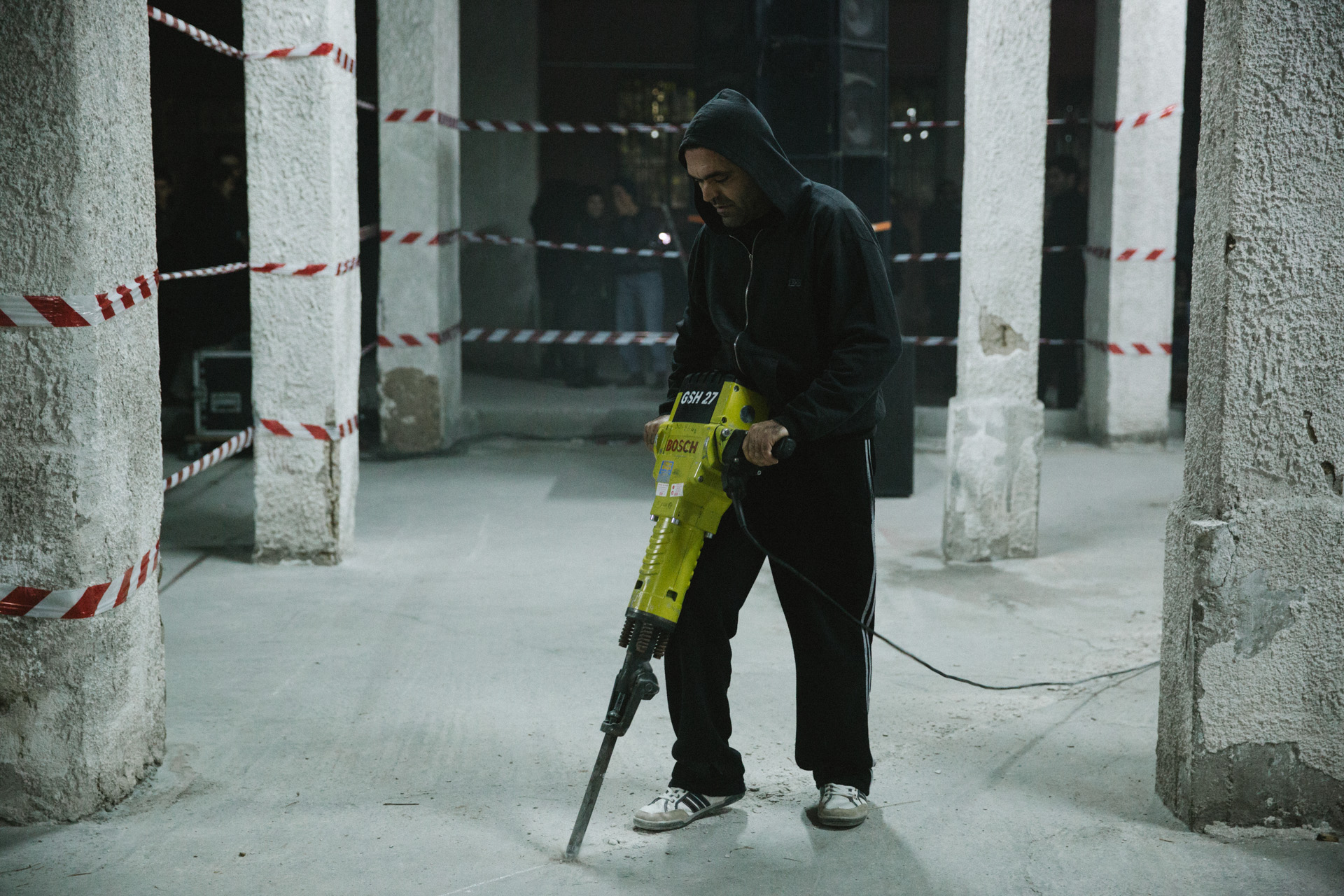 Ο χειριστής του κομπρεσέρ, λοιπόν, σκεπασμένος με μια κουκούλα, ξεκινάει να τρυπάει το έδαφος διασχίζοντας διαγώνια την αίθουσα. Και είναι ένα παράδοξα συναρπαστικό θέαμα. Μια πράξη «βανδαλισμού». Μια πανκ χειρονομία καταστροφής. Ποιος από εμάς δεν έχει φαντασιωθεί πως κάνει άνω-κάτω το γραφείο του στριμμένου του αφεντικού; Ποιος δεν σκέφτηκε έστω και μια φορά να βάλει φωτιά στο κτήριο της εφορίας που ανήκει; Ίσως έτσι εξηγείται το ότι όσοι παρακολουθούν απόψε το τσιμέντο να σπάει, δονούμενοι από τον έντονο θόρυβο, χαμογελούν… Όταν ο χειριστής μετά από δεκαπέντε περίπου λεπτά ασταμάτητης χρήσης του μηχανήματος έχει φτάσει στην άλλη άκρη, στον απέναντι τοίχο, με το πλήθος να τον ακολουθεί, ο θόρυβος σταματάει και μέσα στο βουητό ακούγονται τα πιο θερμά χειροκροτήματα. Βγάζει την κουκούλα, χαμογελάει, δέχεται το φιλί μιας κοπέλας, χαμογελάει ξανά.