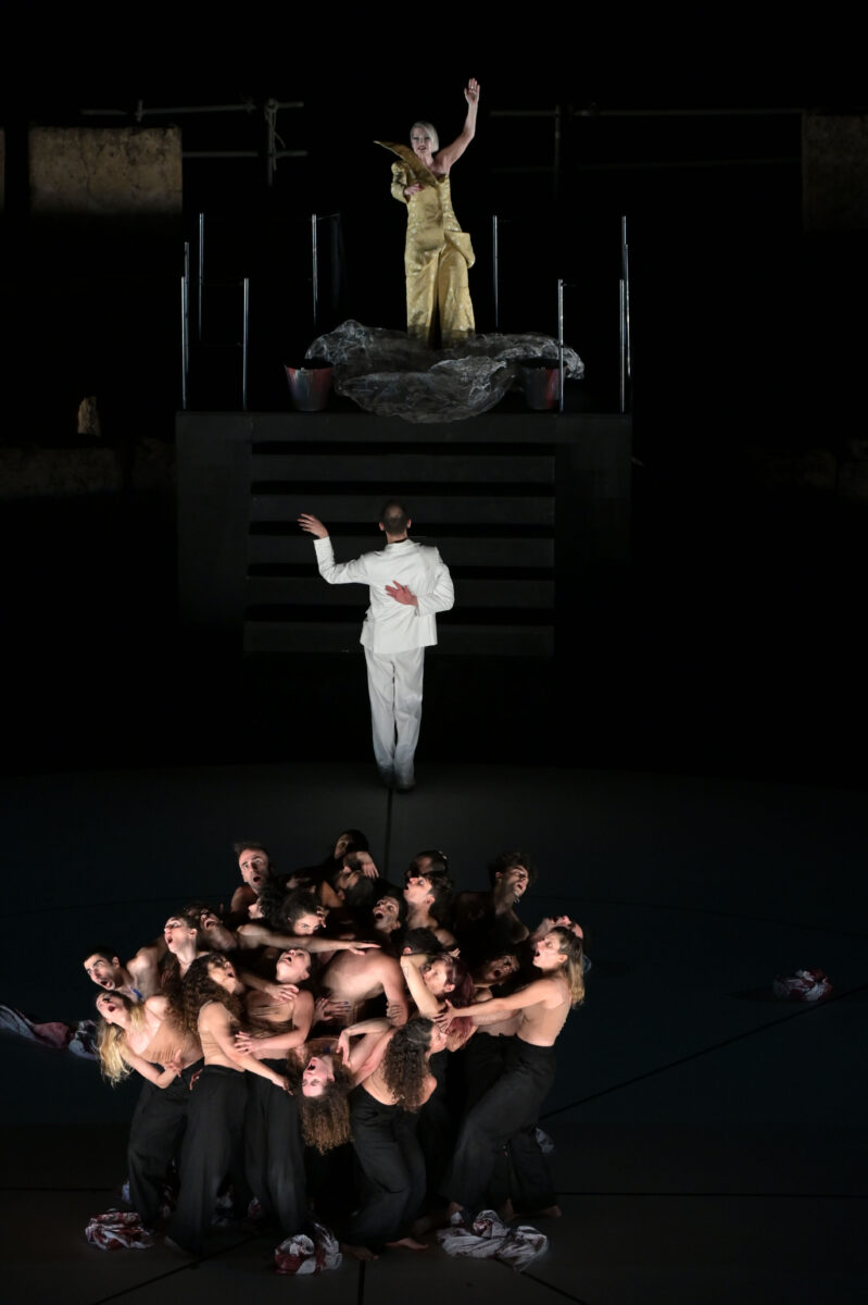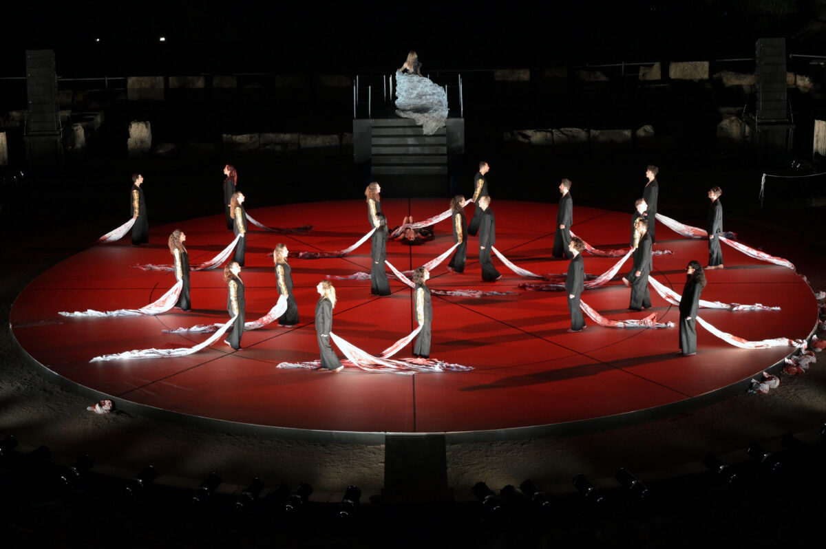 Οι δύο –sold out– παραστάσεις που δόθηκαν μέσα στο πύρινο καμίνι των 40 και βάλε βαθμών, στο θέατρο Φρύνιχος των Δελφών, ήταν ένας πραγματικός άθλος για τους Ηθοποιούς και τον Χορό. Αλλά και για τους θεατές που επί τρεισήμισι ώρες παρακολουθούσαν καθισμένοι σε κερκίδες καυτές σαν λάβα. Και όμως! Κανείς δεν έφυγε γιατί αυτό στο οποίο γινόμασταν μάρτυρες και συμμετείχαμε ψυχή τε και σώματι, ήταν συνταρακτικό. Ελάχιστοι βγήκανε τρέχοντας για να προμηθευτούν δροσερά μπουκάλια νερό από το κιόσκι απέναντι από το θέατρο και να γυρίσουν αμέσως πίσω. Πολλοί ήταν εκεί για να την ξαναδούν δεύτερη ή τρίτη φορά –το λέω και πραγματικά συγκινούμαι. Πολλές οι ενθουσιώδεις και υμνητικές κριτικές που γράφτηκαν δικαίως πέρσι και φέτος. Πρόκειται για μια κορυφαία στιγμή στην ιστορία του θεάτρου μας, δεν χωρά αμφιβολία, ακόμη κι αν τυχόν εκφράσεις διαφορετική άποψη σε κάποιες λεπτομέρειες. Καμία σημασία δεν έχει. Σημασία έχει το όλον της, αυτό το τρομερό συναίσθημα που σε κατακλύζει παρακολουθώντας μια παράσταση η οποία καταφέρνει να διατρέξει τους αιώνες των αιώνων και να φθάσει στο σήμερα και το αύριο κυλώντας σαν νεράκι μέσα σου, παρά τα 200 λεπτά της. Ένα έργο που με δυο λόγια σου λέει πως η ιστορία κύκλους –δυστυχώς– κάνει, δεν πάει να είσαι στον 21ο αιώνα του ίντερνετ και του ΑΙ. Ο άνθρωπος παραμένει το ίδιο απρόβλεπτος, άπληστος, καταστροφικός, δολοπλόκος, εξουσιομανής, αδίστακτος, ιδιοτελής, ανίερος. Αλλά ο άνθρωπος επίσης παραμένει ιδεολόγος, ηθικός, ακέραιος, δίκαιος, προβληματισμένος. Άνθρωπος. Με ενοχές και Ερινύες φορτωμένος, όταν η οργή του τιμωρού καταλαγιάζει μέσα του.