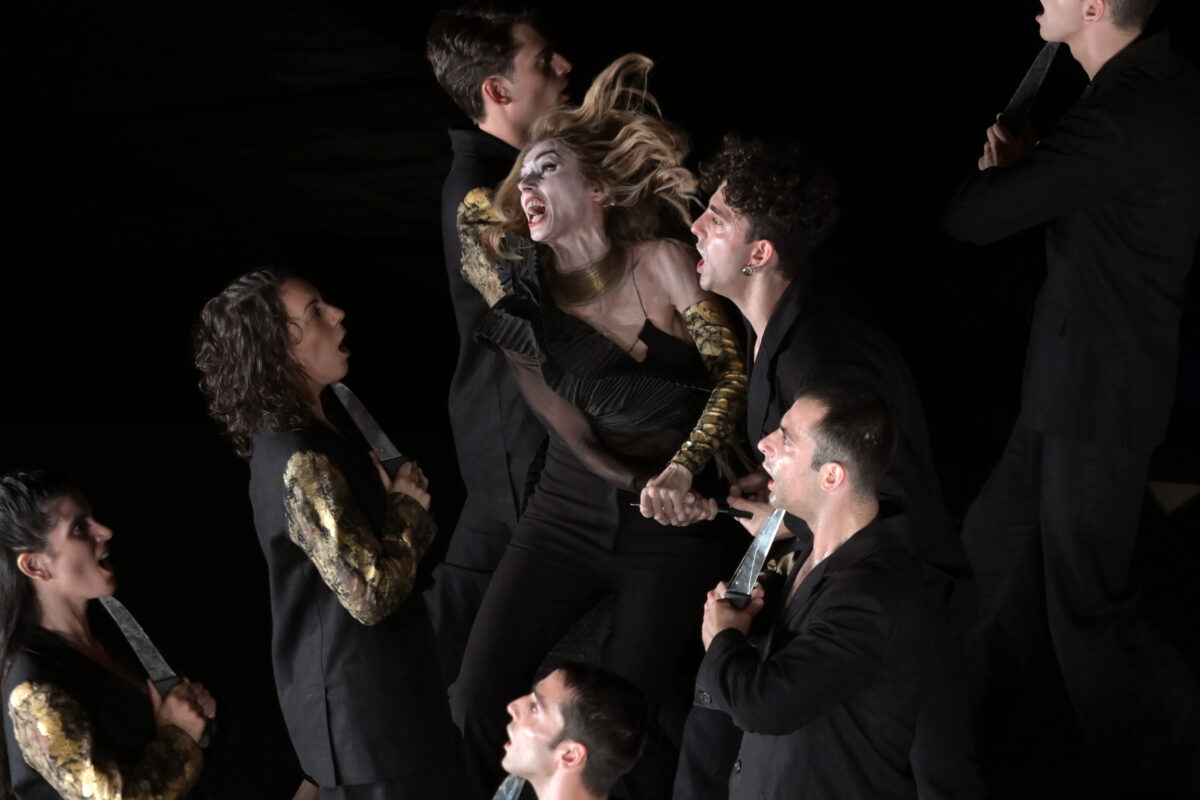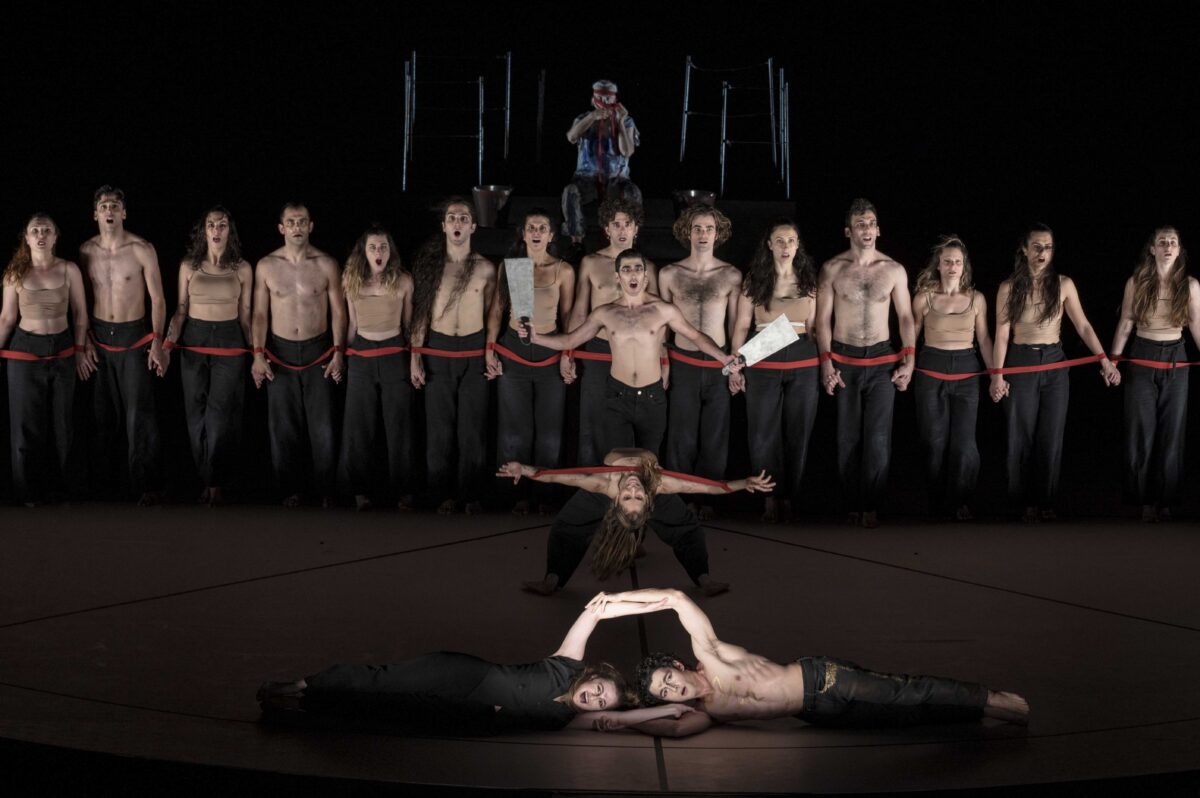 Πέρα από τους εξαιρετικούς Πρωταγωνιστές –την Σοφία Χιλλ ως Κλυταιμνήστρα (εντυπωσιακό πόσο βαθιά ξετυλίγει αυτόν τον τόσο δύσκολο, πολυδιάστατο χαρακτήρα), τον Σάββα Στρούμπο ως Αγαμέμνονα, τη Νιόβη Χαραλάμπους ως Ηλέκτρα, τον Κωνσταντίνο Ζωγράφο ως Ορέστη, τον Τάσο Δήμα ως Φύλακα, την Έβελυν Ασουάντ ως Κασσάνδρα, τον Νίκο Ντάση ως Απόλλωνα και όλους τους άλλους- είναι ο εκπληκτικός Χορός που ανεβάζει αυτήν την παράσταση στην κορυφή. Δεν έχω δει ποτέ ξανά κάτι παρόμοιο. Είκοσι δύο άτομα σε ένα σώμα μια ψυχή, σε απόλυτο συντονισμό, πειθαρχία, ρυθμό, αρμονία, ταίριασμα –σε κάποια στιγμή, στις Ευμενίδες, φθάνουν να δεθούν ως κόμπος κυριολεκτικά! Η πλαστικότητα των σωμάτων τους, η διαχείριση του κάθε μέλους του σώματός του από τον ίδιο τον ηθοποιό και παράλληλα η τέλεια ένταξή του σε ένα σύνολο αλλά και το απόλυτο δέσιμο με τους ηθοποιούς που ερμηνεύουν τους μονολόγους, είναι απίστευτη. «Είναι του μαέστρου όλη αυτή η παρτιτούρα», όπως επεσήμανε ο Δαυίδ Μαλτέζε για τον μεγάλο δάσκαλο που έγραφε στο σκηνοθετικό του σημείωμα: «Η αισθητική της παράστασης προκύπτει από τη δυναμική σχέση του Σώματος με τον Μύθο, τον Χρόνο και τη Μνήμη». Ο θεατής γίνεται μάρτυρας ακριβώς αυτών των λόγων μέσα από τον άθλο είκοσι δύο σωμάτων –είκοσι δύο νέων παιδιών που δεν πρόκειται να ξεχάσουν ποτέ την εμπειρία της συμμετοχής τους σε αυτήν την παράσταση.