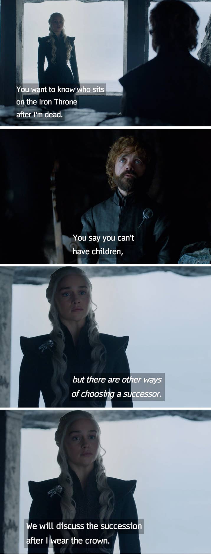 Ίσως ο Τύριον της αποκάλυψε ότι η Νταινέρυς δεν μπορεί να κάνει παιδιά και ότι θα φροντίσει το παιδί της να πάρει την εξουσία όταν εκείνη πεθάνει. Τον είδαμε άλλωστε σε προηγούμενο επεισόδιο να επιμένει πως η Καλίσι πρέπει να χρίσει κάποιον ως διάδοχό της.