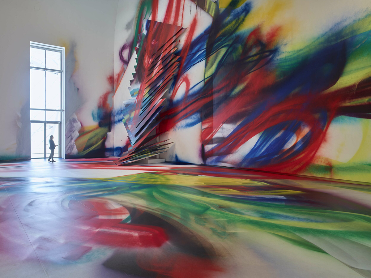 Katharina Grosse, Splinter, 2022, Acrylic on plywood, wall and floor 1750 x 1000 x 2200 cm © Adagp, Paris, 2022 © Fondation Louis Vuitton / Marc Domage