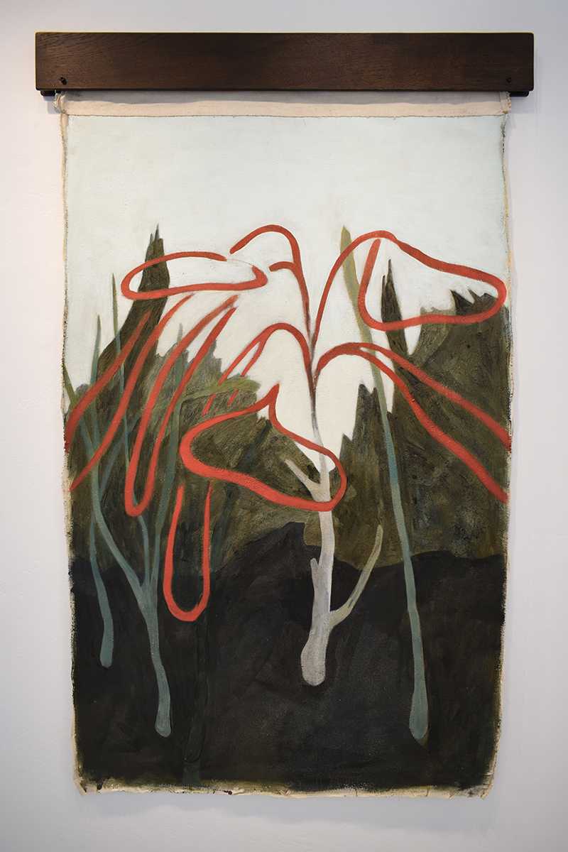 Ιάσονας Καμπάνης, Κι εδώ θα σταματούν τα υπερήφανα κύματα σου, 2024, 170 x 100 x 4 εκ, ακρυλικό, σκόνη ξύλου, ύφασμα γιούτα, ατσάλινη μπάρα, κομμάτι δρυός. Παραχώρηση του καλλιτέχνη και της CITRONNE Gallery.