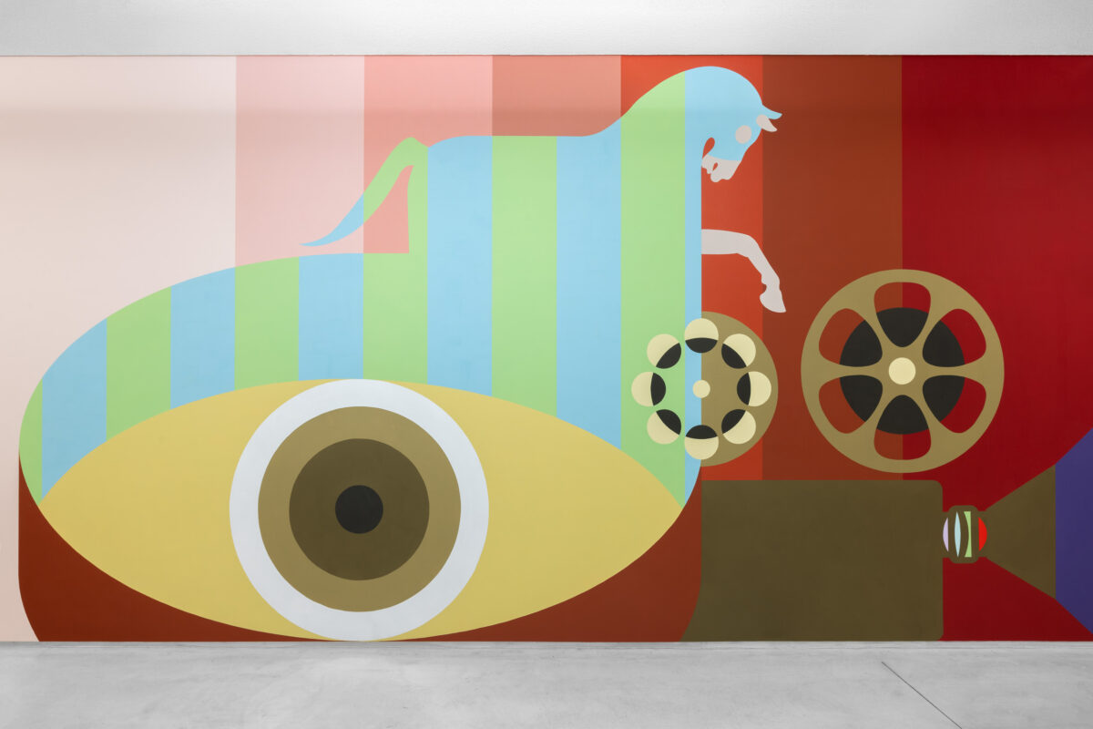 Το νέο έργο του Kasper Bosmans για το ΕΜΣΤ με τίτλο The Fuzzy Gaze (Το Θολό Βλέμμα, 2025) εξετάζει τη μεταλλαγή των ρόλων που κατείχαν τα ζώα στον κόσμο του ανθρώπου διαμέσου του χρόνου. Πρόκειται για μια μεγάλης κλίμακας τοιχογραφία που εξερευνά σε αδρές γραμμές την ιστορία και εξέλιξη του αμφίδρομου βλέμματος μεταξύ ανθρώπου και ζώου υπό τη μορφή μιας πομπής. Φέρνει στο προσκήνιο τους διάφορους ρόλους που αναθέτουμε ή αποδίδουμε στα ζώα – της συντροφιάς, του ψυχαγωγού, του εμπορεύσιμου προϊόντος – ρόλους που διαμορφώνονται ώστε να εκπληρώνουν τις χρηστικές μας ανάγκες ή την επιθυμία μας για θέαμα και θαλπωρή. Άλογα, λούτρινα αρκουδάκια κι αιλουροειδή εμφανίζονται στην παρέλαση που παραπέμπει στο τσίρκο αλλά και στον ζωολογικό κήπο.