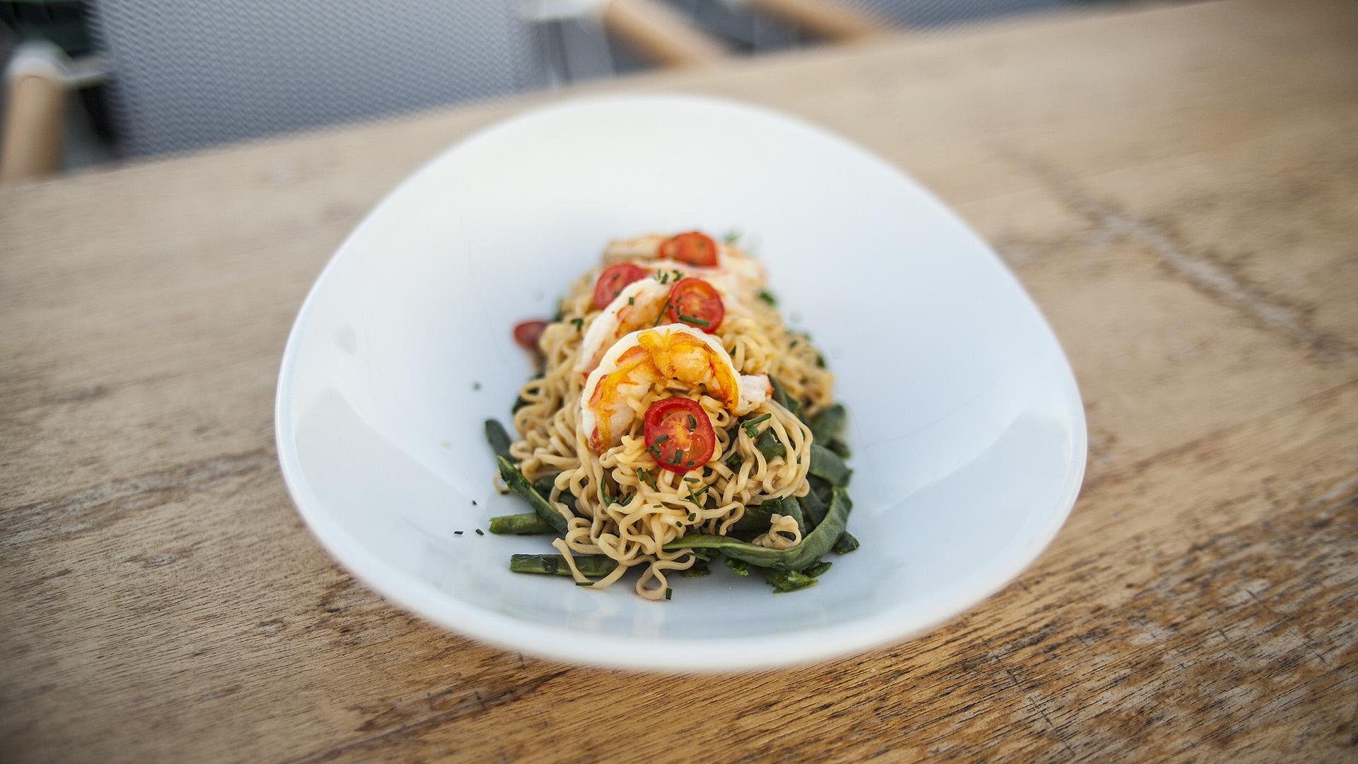 Noodles με αμπελοφάσουλο, κόλιανδρο και γαρίδες
