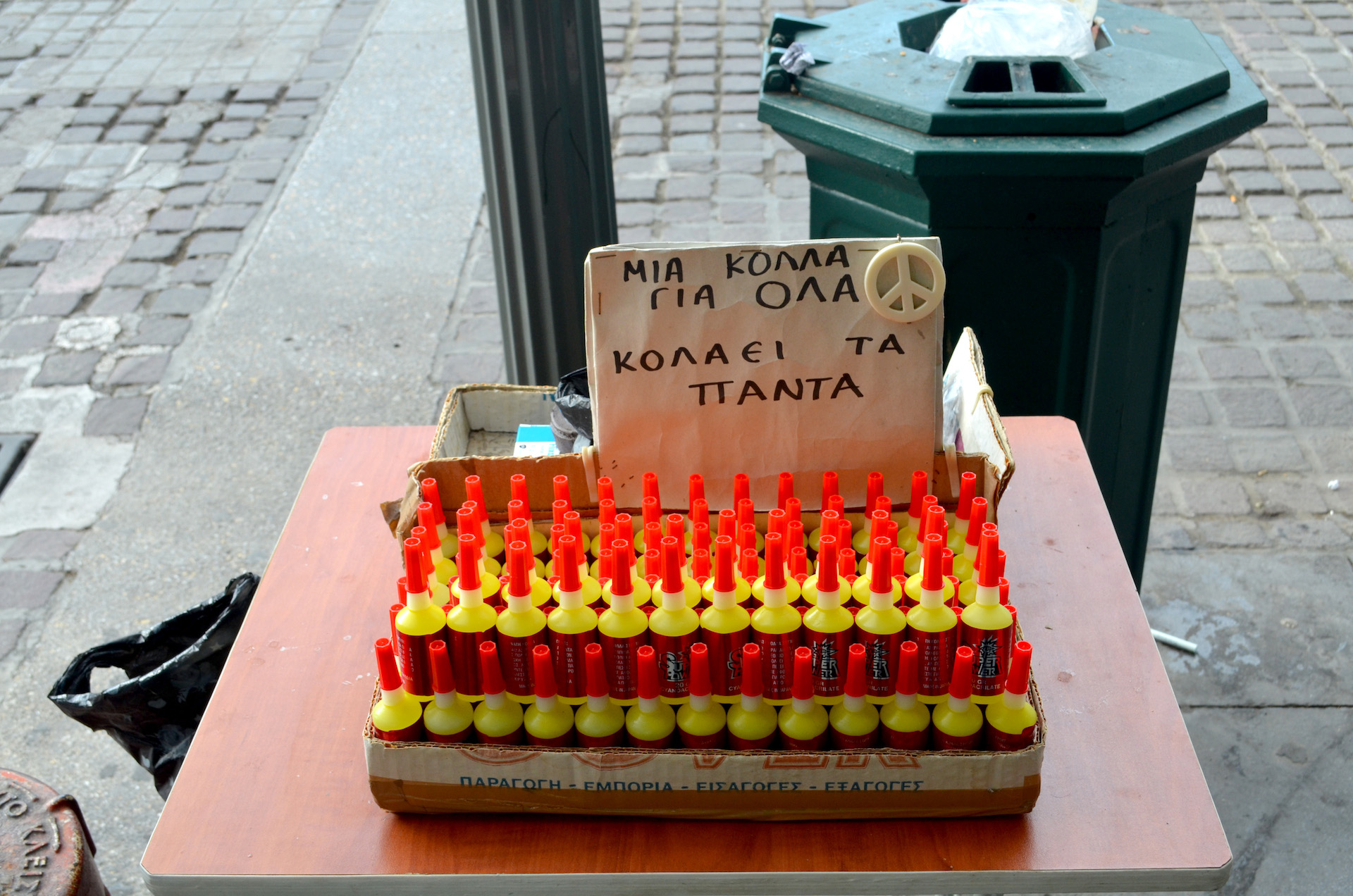 Η κόλλα που τα κολλάει όλα (ή ”κολάει” κατά αυτόν που έγραψε το χαρτόνι). Ο Δημήτρης λέει πως το συγκεκριμένο προϊόν κάνει θραύση εδώ και 25 χρόνια, πωλείται στην συμφέρουσα τιμή των δύο ευρώ και καθημερινά περνάει κόσμος και κοσμάκης που κολλάει επιτόπου πράγματα, προκειμένου να το δοκιμάσει. Το ”αν σπάσει το γυαλί, ποτέ δεν ξανακολλάει” μόλις καταρρίφθηκε σαν ατάκα.