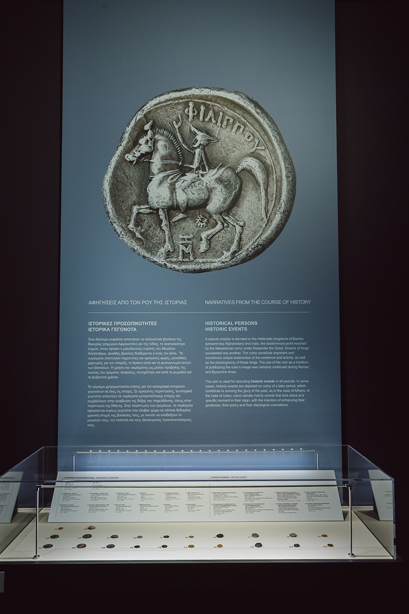 Στις προθήκες των ιστορικών χρόνων, κυριαρχούν τα πορτρέτα σπουδαίων ηγεμόνων, ξεκινώντας ασφαλώς από τον Μέγα Αλέξανδρο, μία από τις σημαντικότερες προσωπικότητες που άφησαν τη δική τους ανεξίτηλη σφραγίδα στην ιστορία. Αν και θεοποιημένη, η μορφή που απαθανατίστηκε στα νομίσματα των Διαδόχων του και όχι στα δικά του. Ακολουθεί μία νομισματική πινακοθήκη ηγεμόνων, ανάμεσα στους οποίους ανακαλύπτουμε και τον σπουδαίο βασιλιά της Σπάρτης, τον Κλεομένη Γ΄, σε ένα από τα 10 σήμερα γνωστά νομίσματα σε όλο τον κόσμο. Μέσα από τα νομίσματα γνωρίζουμε δύο άγνωστους ηγεμόνες τον Υσπαοσίνη και τον Τιγραίο, που κυβέρνησαν στις περιοχές του σημερινού Ιράκ και Ιράν αντίστοιχα και πλήθος βασιλέων από τη Βακτρία (το σημερινό Αφγανιστάν) και την Ινδία, το ανατολικότερο σημείο όπου έφτασε ο στρατός του Μεγάλου Αλεξάνδρου.