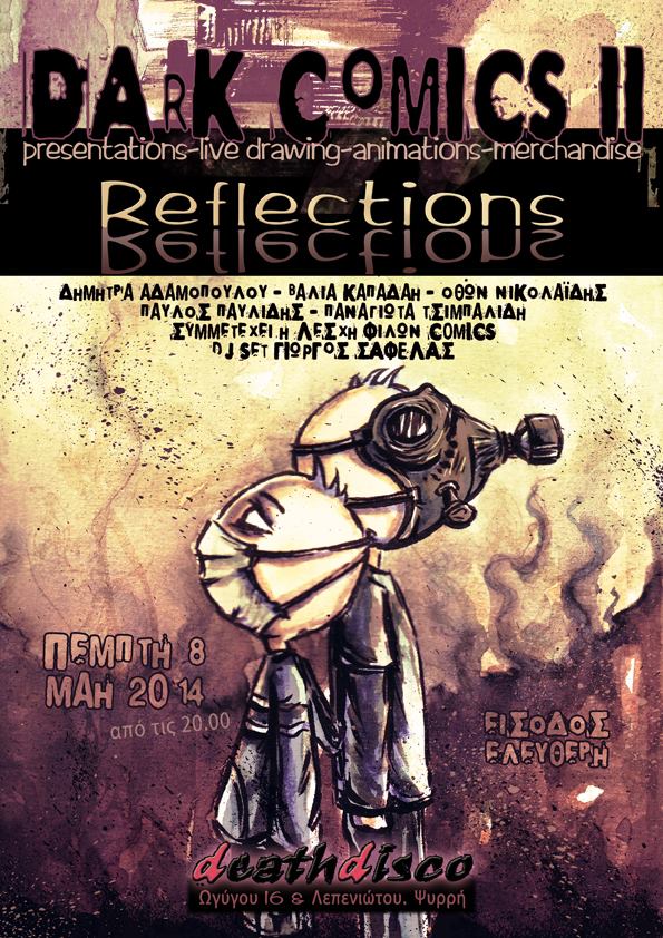 Για δεύτερη φορά στα Reflections μια πιο σκοτεινή πλευρά της 9ης τέχνης διασταυρώνει τις δυνάμεις της με τη μουσική και έρχεται στο Death Disco να γεμίσει την οθόνη και τους τοίχους με χρώματα,σε μια διαδραστική βραδιά όπου οι δημιουργοί σχεδιάζουν live για εσάς!Μαζί μας αυτή τη φορά και η Λέσχη Φίλων Κόμικς! Στα decks ο Γιώργος Σαφέλας.