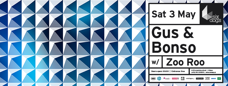 Το δημοφιλές Αθηναικό DJ δίδυμο των Gus & Bonso, για τρίτη και τελευταία φορά τη φετινή σεζόν, στο gig space του six d.o.g.s., για ένα house και techno DJ set. Μαζί τους οι Zoo Roo. Το ντουέτο δημιουργήθηκε το 2007 και απο τότε έχει εμφανιστεί στα μεγαλύτερα clubs της χώρας, όπως τα Sixx, Blend, Barrage, Cavo Paradiso, Cariocas, Dybbuk, PlusX, Motel, Mamacas κ.α, σε clubs της Ολλανδίας και της Κύπρου.