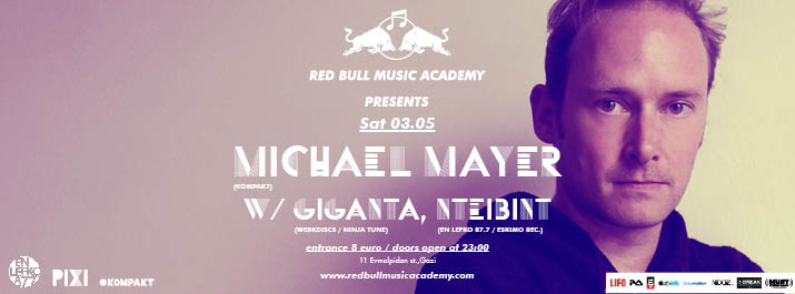 H Red Bull Music Academy και ο Εν Λευκώ καλωσορίζουν τον Michael Mayer στο PIXI Club, σε μια βραδιά με πολύ χορό! Ο Michael Mayer είναι στην ελίτ της Γερμανικής μουσικής σκηνής και ταξιδεύει ανά τον κόσμο για dj sets ενώ κάνει παραγωγή και promo στο δικό του label, Kompakt. Opening act από τη Giganta και closing act από τον NTEIBINT.