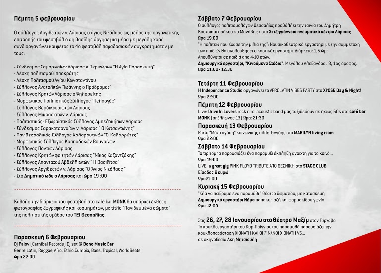 6 χρόνια τώρα δεν έχουμε πάρει ούτε ένα ευρώ! Δε μπορούμε να δεχτούμε χρήματα. Ζητάμε τρόφιμα. Τόσο απλό. Ο δήμος Λαρισαίων απλώς μας τυπώνει τις αφίσες και τα flyer, είναι η μόνη παροχή που έχουμε. Με έχουν προσεγγίσει και πολιτικοί λόγω της επιτυχίας της συγκέντρωσης των τροφίμων αλλά δεν θέλω καμία ανάμειξη με όλα αυτά γιατί είναι ψηφοθηρικό. Δεν είμαι κομματικοποιημένος, απλώς πολιτικοποιημένος. Εμείς ψάχνουμε κοινές γραμμές με ανθρώπους και καλλιτέχνες ώστε να προωθήσουμε το φεστιβάλ αυτό και σε άλλες πόλεις. Ήδη γίνεται στην Καρδίτσα, στην Κομοτηνή, στα Τρίκαλα και φέτος για πρώτη φορά θα πάει εκτός συνόρων, στη Γερμανία. Κάνουμε λοιπόν ένα ανοιχτό κάλεσμα σε ανθρώπους και καλλιτέχνες που ενδιαφέρονται να προσφέρουν αφιλοκερδώς, προκειμένου να βοηθήσουμε όλοι ουσιαστικά τους ανθρώπους που έχουν ανάγκη!