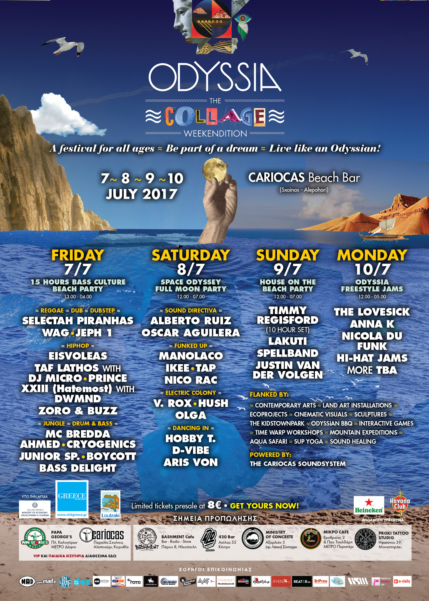 Το θέμα του φετινής Οδύσσειας είναι το «Collage» η σύνθεση δηλαδή διαφορετικών υλών, υφών και στυλ, είτε αυτό αφορά την μουσική είτε τις εικαστικές τέχνες και τις εναλλακτικές μορφές δράσης και ψυχαγωγίας, είτε τους ίδιους τους ανθρώπους που θα μετάσχουν στο φεστιβάλ, και όλα αυτά μέσα σε ένα υπέροχο φυσικό περιβάλλον, στο γραφικό παραθαλάσσιο ψαροχώρι που βρίσκεται στον κόλπο του Σχίνου, κάτω από τα επιβλητικά Γεράνεια όρη με θέα τις Αλκυονίδες νήσους.