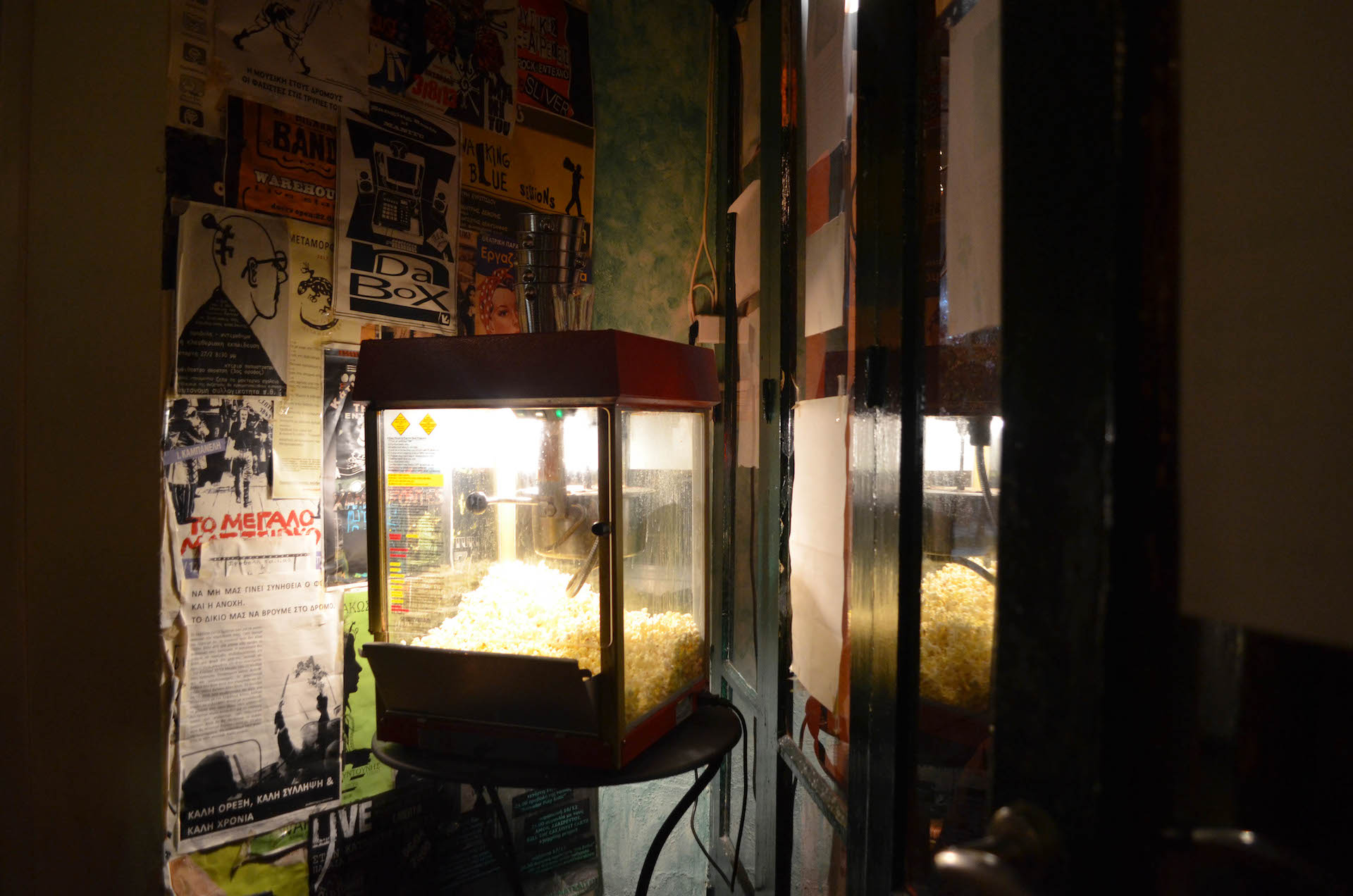 Α: Τη βλέπεις τη μηχανή του ποπ-κορν; Στην αρχή είχαμε μία μικρότερη, εδώ πίσω από το μπαρ. Μετά έψαξα και βρήκα μία μεγαλύτερη ώστε όποιος θέλει να μπορεί να έρχεται να κάνει refill χωρίς να αισθάνεται άβολα και χωρίς εμείς να χρειάζεται να τρέχουμε αλαφιασμένοι με κουπάκια στο χέρι από τραπέζι σε τραπέζι.