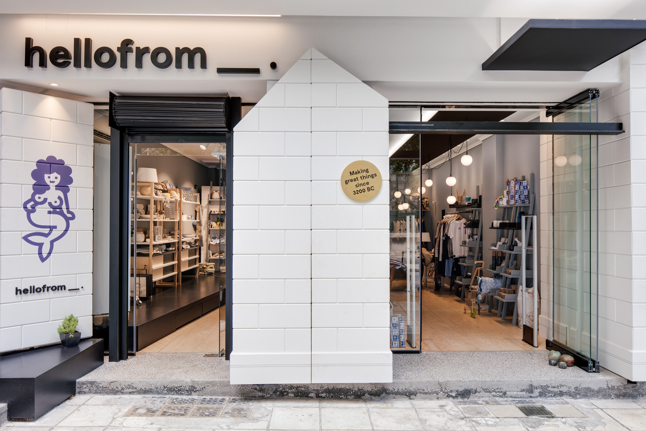 To hellofrom βρίσκεται ακριβώς πάνω από την πανεπιστημιούπολη: «Τη δημιουργία/ανάπτυξη του brand έχουν αναλάβει οι Beetroot Design Group, καθώς επίσης και ό,τι αφορά στο σχεδιασμό του καταστήματος σε συνεργασία με το αρχιτεκτονικό γραφείο The Cabinet», μια σκέψη που σηματοδοτεί την επιτυχία του project ακόμη κι εκτός κέντρου σε συνδυασμό με το γεγονός ότι το hellofrom Thessaloniki άνοιξε σε μία ιστορική γειτονιά του κέντρου της Θεσσαλονίκης: «Με έμπνευση την εμπορική δραστηριότητα της πόλης του 19ου αιώνα και των αρχών του 20ου και με σεβασμό στην αρχιτεκτονική κουλτούρα του αστικού τοπίου σχεδιάστηκε ένας χώρος, ο οποίος συνδέεται αρμονικά όχι μόνο με το περιβάλλον αλλά και με όλες τις δημιουργίες που φιλοξενεί. H hellofrom Thessaloniki είναι ένα αυθεντικό concept store που αποπνέει κομψότητα και φινέτσα, ένας χώρος με έντονες vintage αναφορές, όπως ο μαρμάρινος νιπτήρας του 1920 που καλεί τον επισκέπτη να φρεσκαριστεί ακούγοντας μελωδίες μιας άλλης εποχής. Ο χρόνος απλά σταματά και ο επισκέπτης καλείται να γίνει ταξιδευτής στις ίδιες του τις αναμνήσεις σ’αυτό το αληθινό hidden gem.»