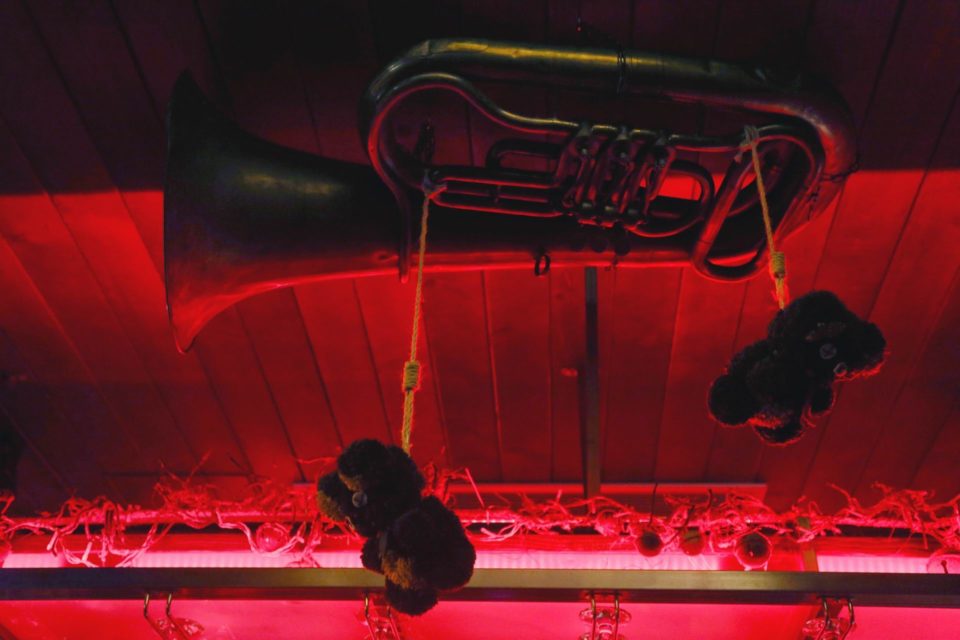 Το ταβάνι και τους τοίχους κοσμούν πνευστά.