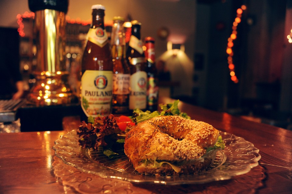Bagel γεμισμένο με καπνιστό σολομό, τυρί κρέμα και μαρούλι