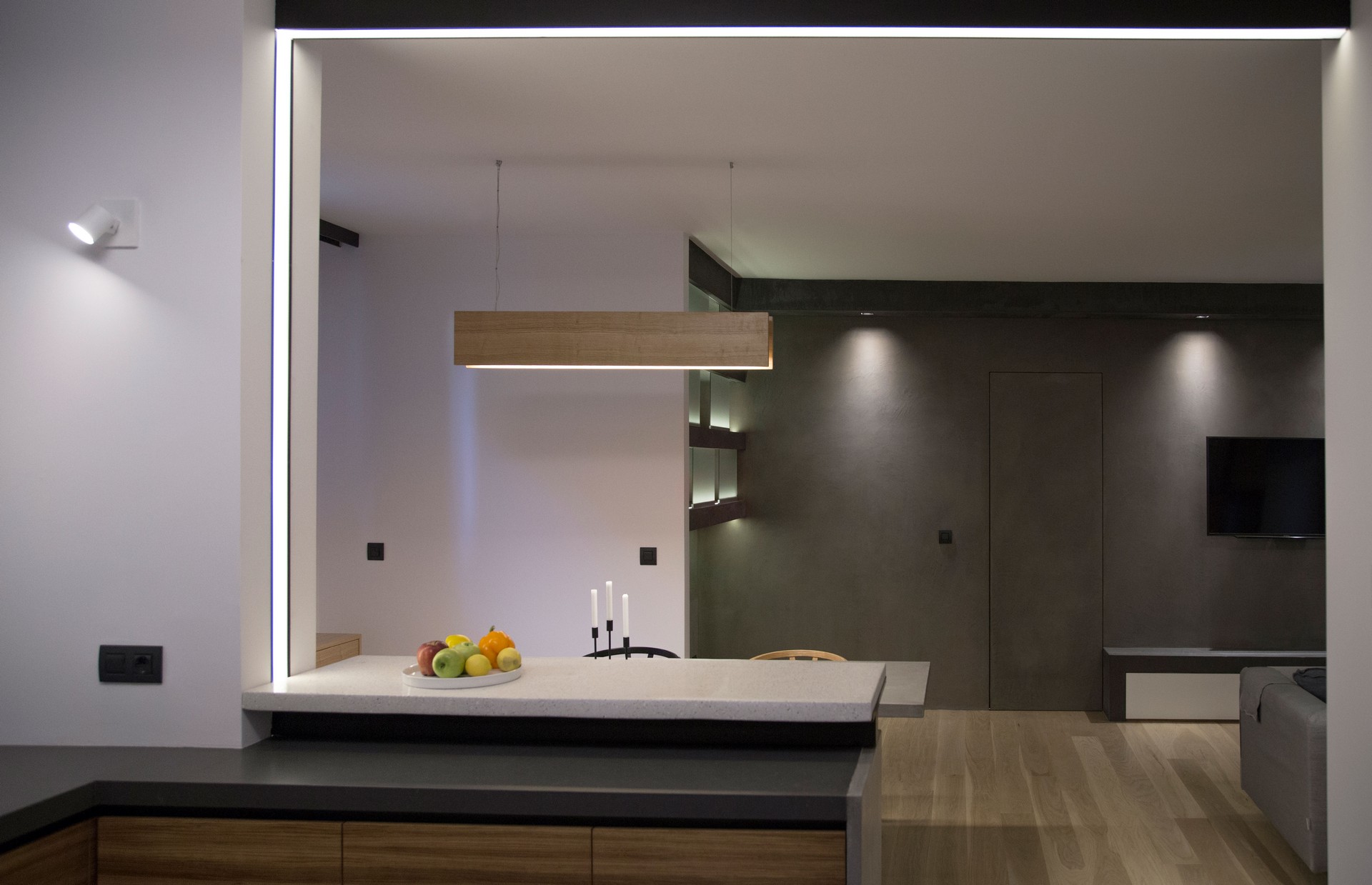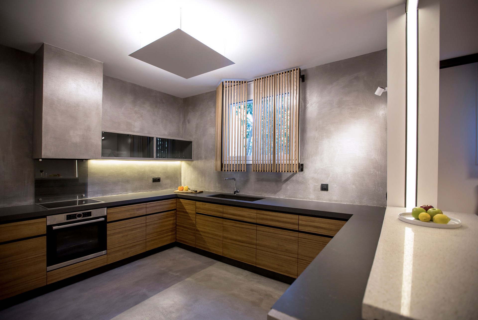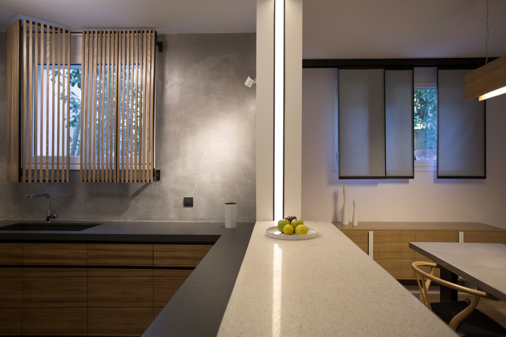 Εκτός από την κατασκευή του πάσου, πάνω στο οποίο έχει τοποθετηθεί ένας πάγκος από μωσαϊκό, αυτό επιτυγχάνεται τόσο με την αλλαγή του υλικού του δαπέδου από ξύλο σε τσιμεντοκονία, όσο και με τη δημιουργία ενός γραμμικού μεταλλικού φωτιστικού που διατρέχει σε όλο το μήκος τη μια πλευρά της οροφής της κουζίνας και λειτουργεί έτσι ως ένα είδος κορνίζας του χώρου.