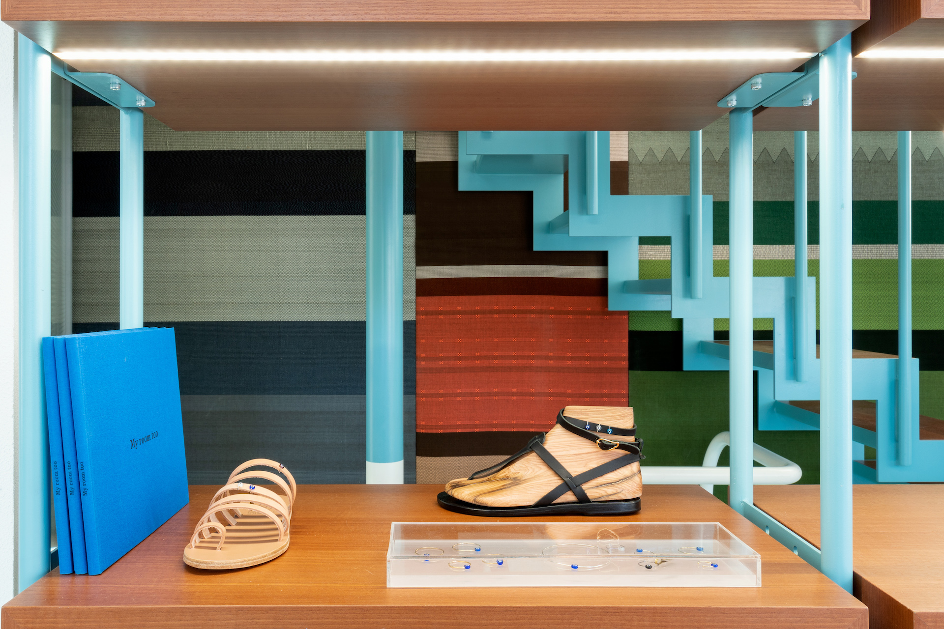 Tailor made έπιπλα, παραδοσιακές τεχνικές όπως το υφαντό που καλύπτει έναν ολόκληρο τοίχο, το μωσαϊκό που παραπέμπει σε πισίνα και τα φυτά συμπληρώνουν τη σημειολογική παλέτα του καταστήματος που λειτουργεί ως εστία συνάντησης αλλά και σαν κεντρικό σημείο θέασης της πόλης, μία παλέτα που ολοκληρώνεται με την ιδιαίτερη παρουσία του φυσικού δέρματος vachetta, της αγαπημένης πρώτης ύλης των Ancient Greek Sandals.