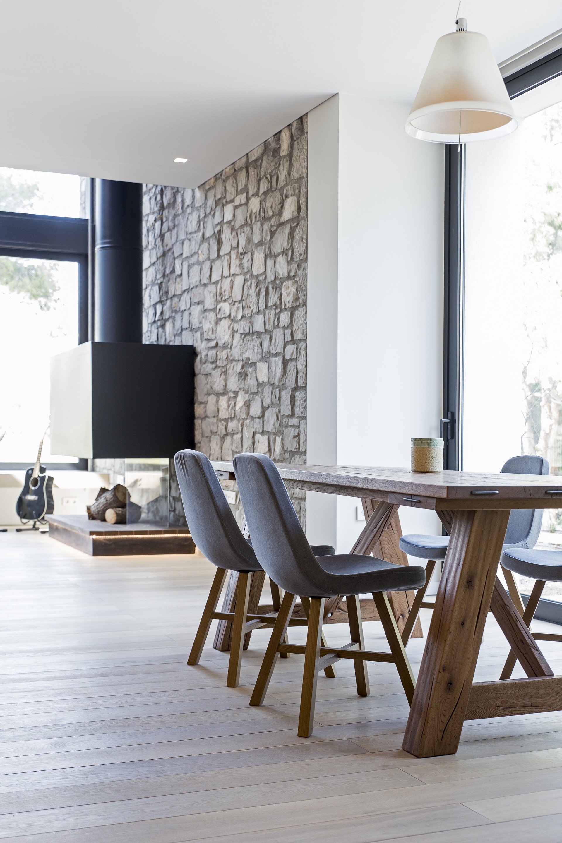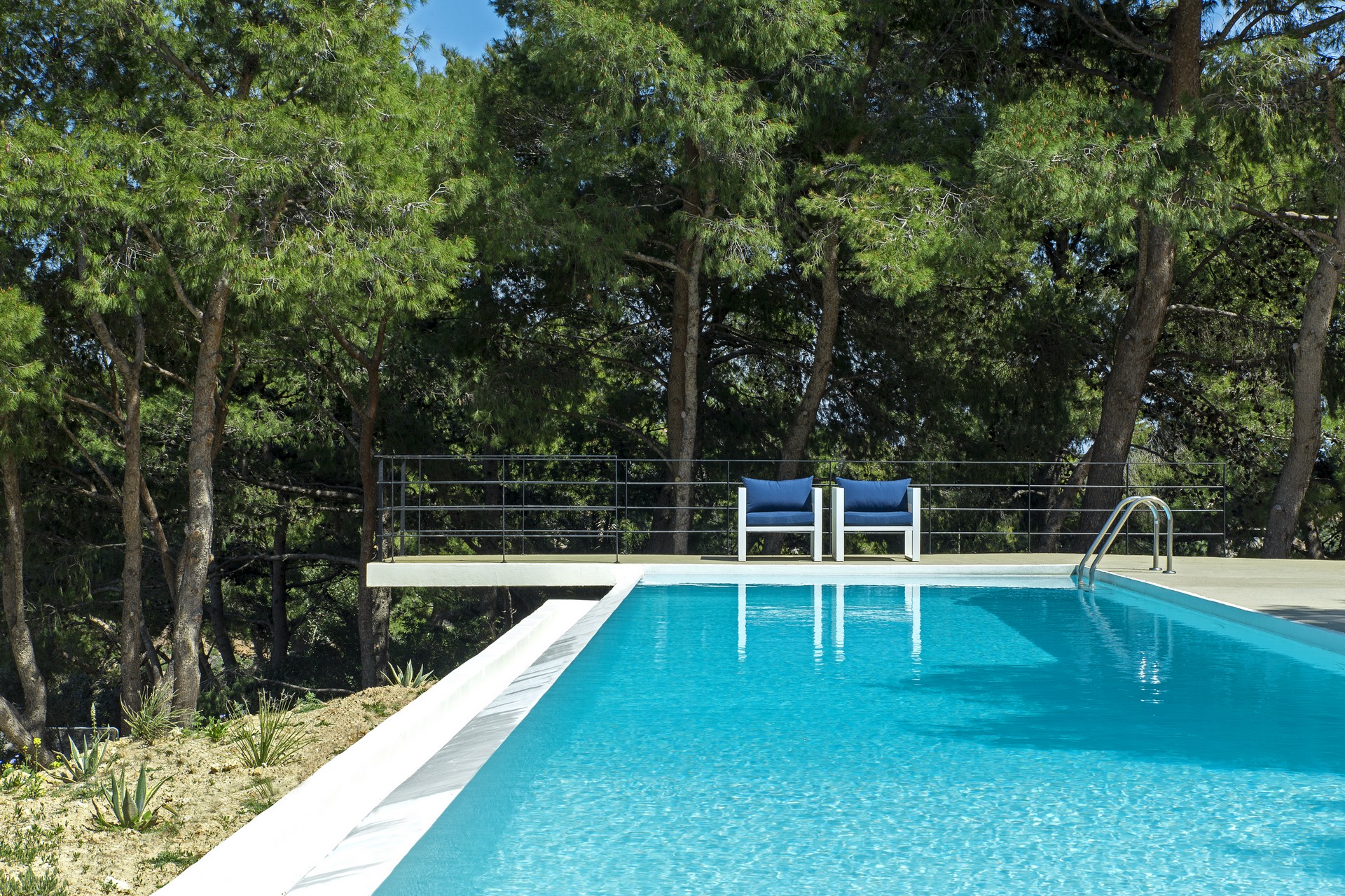 «Πέρα από την κατά τόπους πυκνή του βλάστηση, υπήρχε μεγάλη υψομετρική διαφορά είκοσι μέτρων μεταξύ της εμπρόσθιας και της πίσω όψης του οικοπέδου με σχεδόν κατακόρυφα πρανή και στις δυο όψεις που καθιστούσαν την πρόσβαση ιδιαίτερα δύσκολη. Η ύπαρξη μιας επιφάνειας με ήπια κλίση εντός του καθόρισε ως αναπόφευκτη την τοποθέτησή του κτιρίου σε αυτήν», εξηγούν οι αρχιτέκτονες.