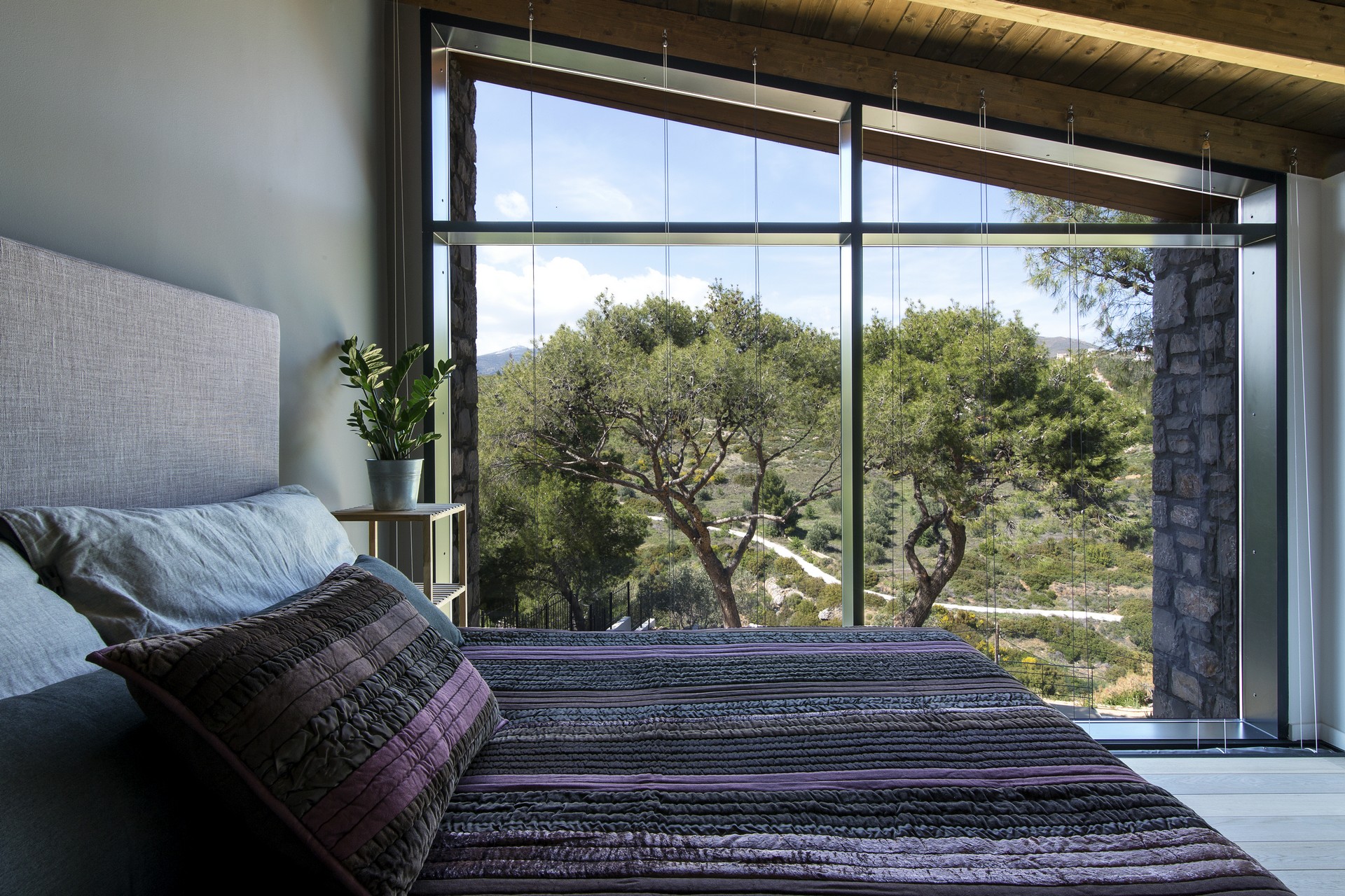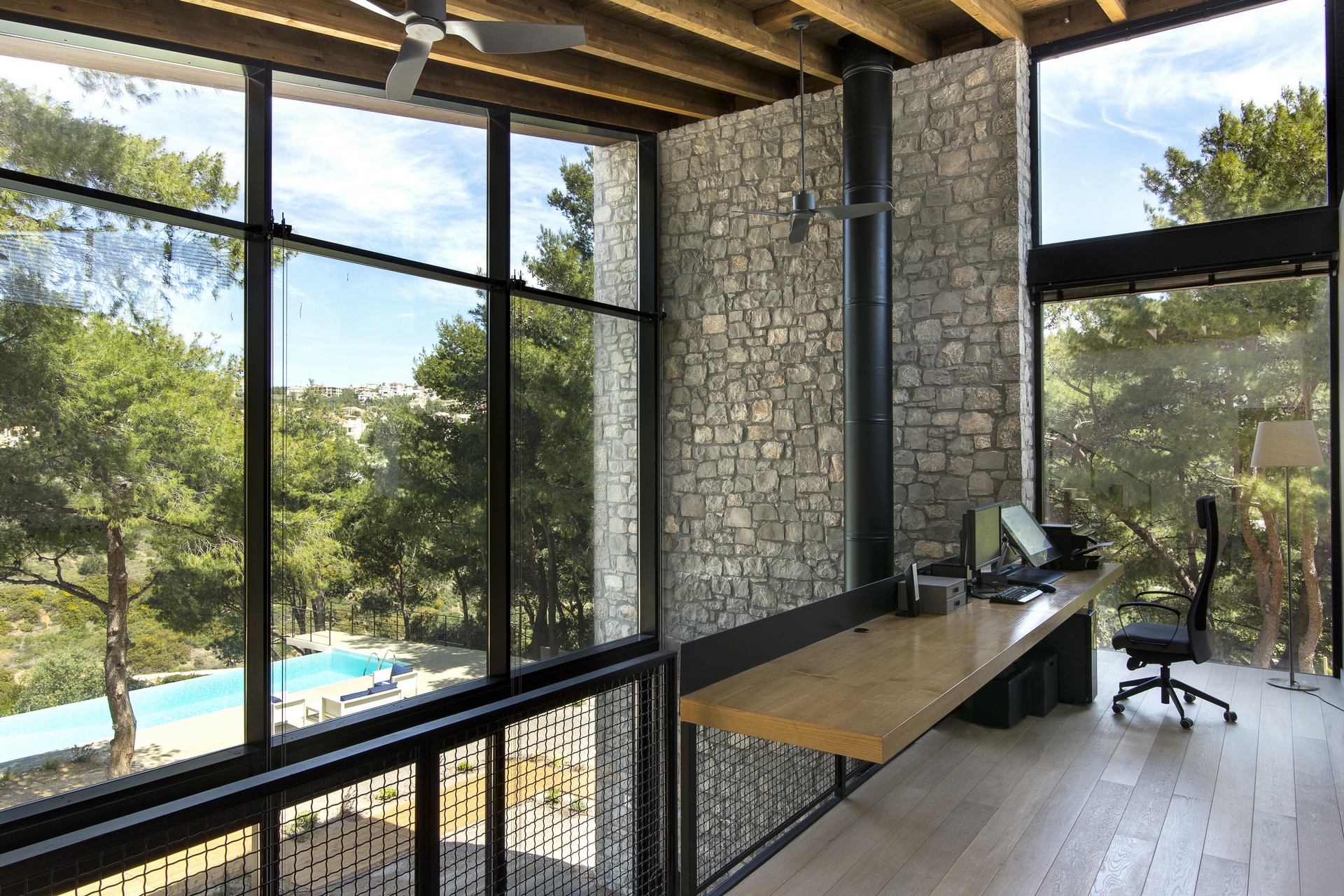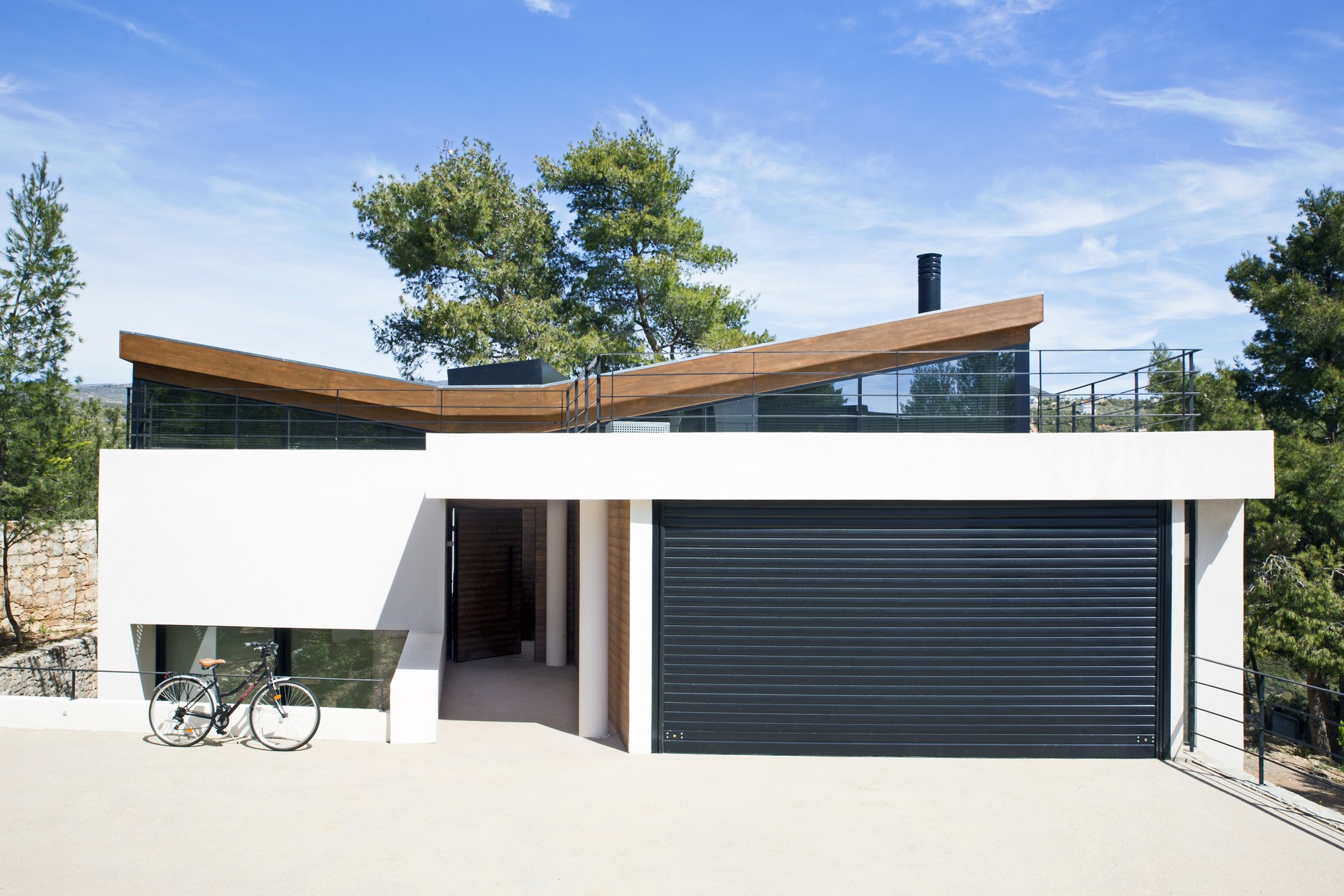 Λόγω της απότομης κλίσης του οικοπέδου το κλειστό γκαράζ βρίσκεται δίπλα στην κύρια είσοδο, ακριβώς πάνω από τους χώρους διημέρευσης. Στην χαμηλότερη πλευρά του οικοπέδου και πέρα από το δρόμο, υπάρχει ένα μικρό φαράγγι με ένα στενό ρέμα. Εξαιτίας της υψομετρικής διαφοράς η ροή του δεν είναι ορατή, ακούγεται όμως ο ήχος του νερού. «Για τον λόγο αυτό η μακρόστενη πισίνα τοποθετήθηκε παράλληλα με το ρέμα και σε πολύ υψηλότερη στάθμη ώστε να αναπαράγει τον υφιστάμενο περιβάλλοντα χώρο».