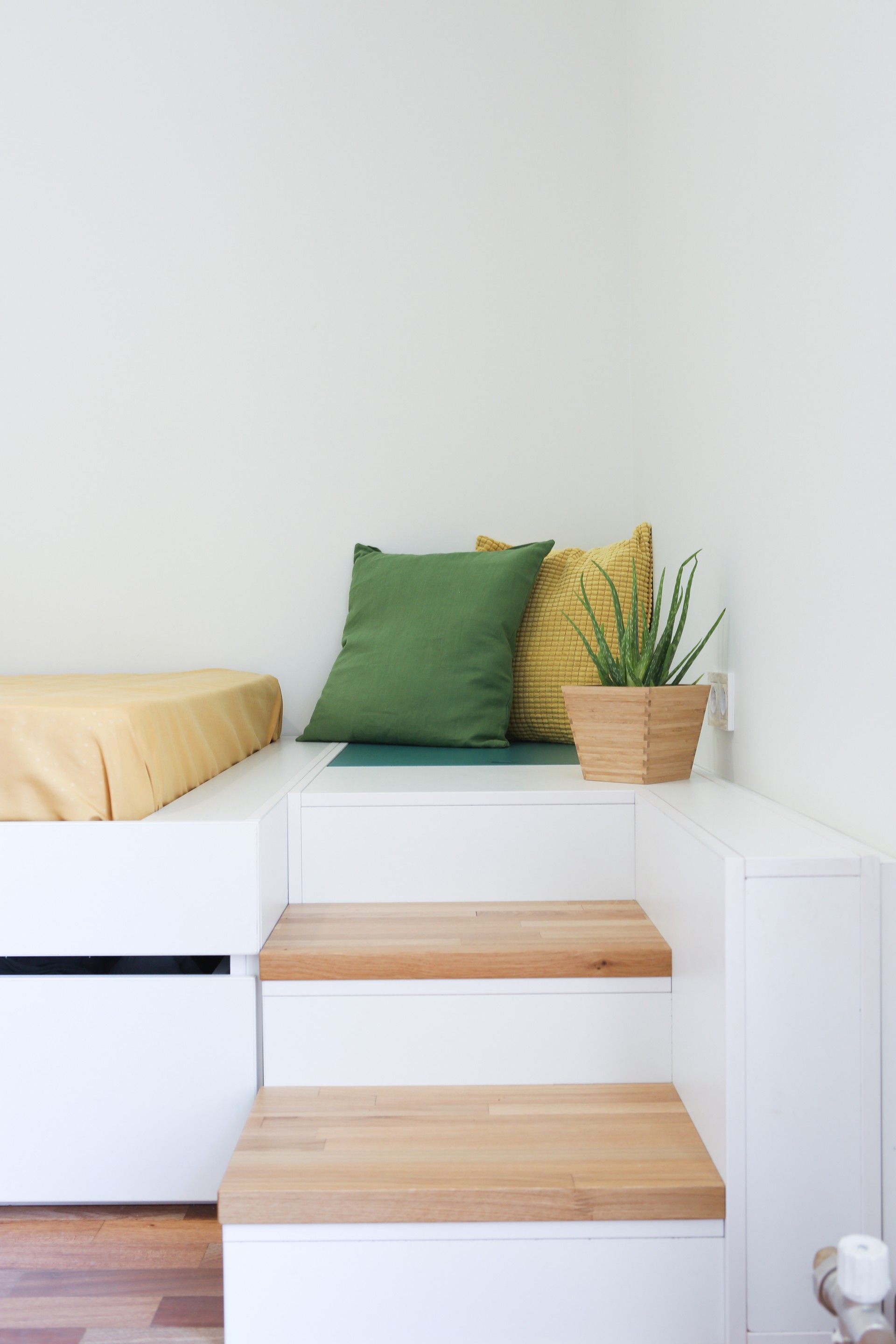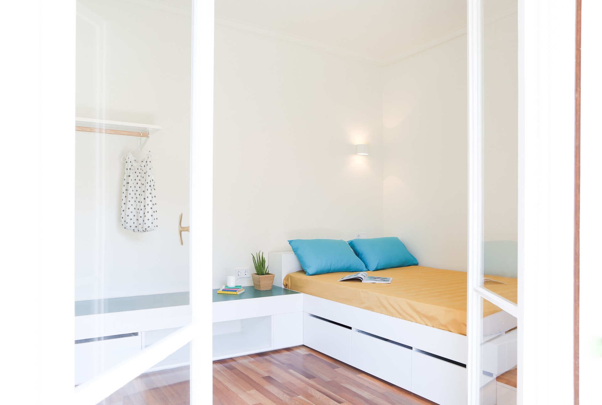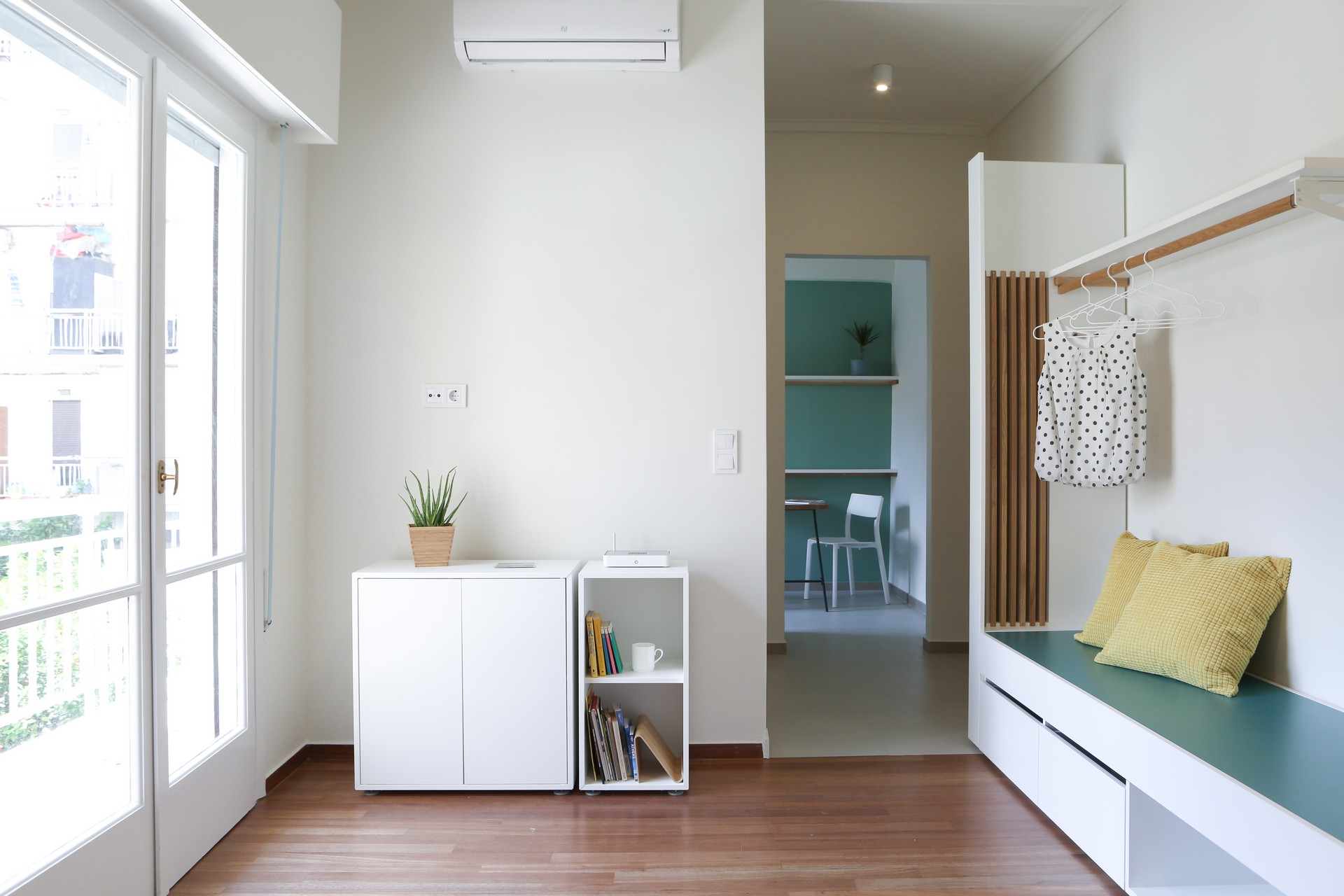 Στα 28 τετραγωνικά του μέτρα, βασικό άξονα του σχεδιασμού αποτέλεσε η εργονομία. Μια ξύλινη κατασκευή λειτουργεί ως ένα πολυλειτουργικό έπιπλο, το οποίο ενσωματώνει διπλό κρεβάτι, χώρους αποθήκευσης και καθιστικό, σε ένα ενιαίο σύνολο.