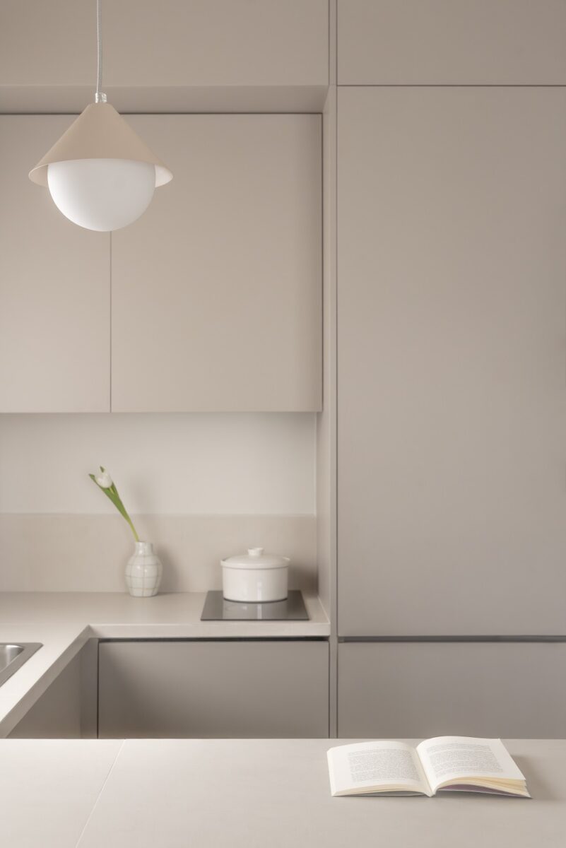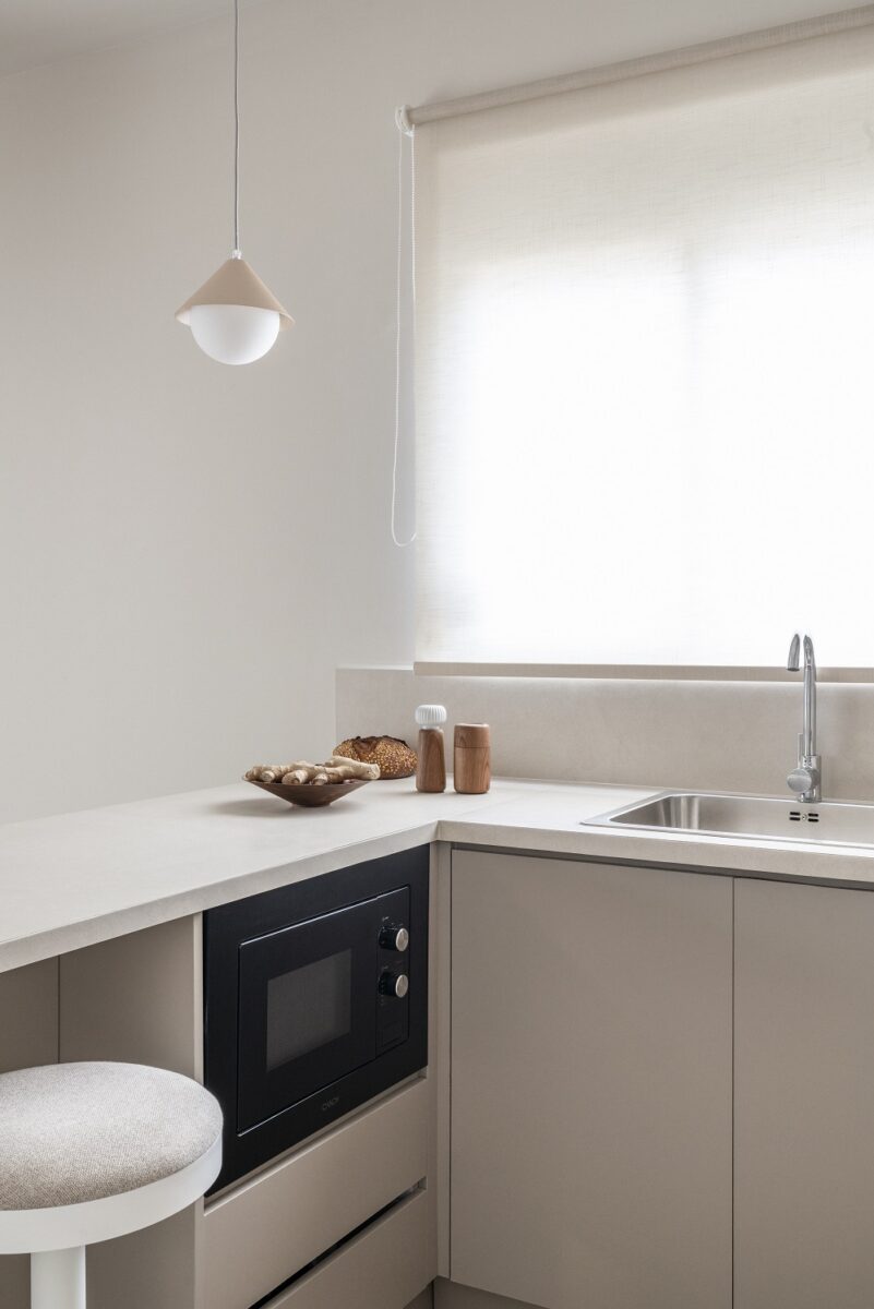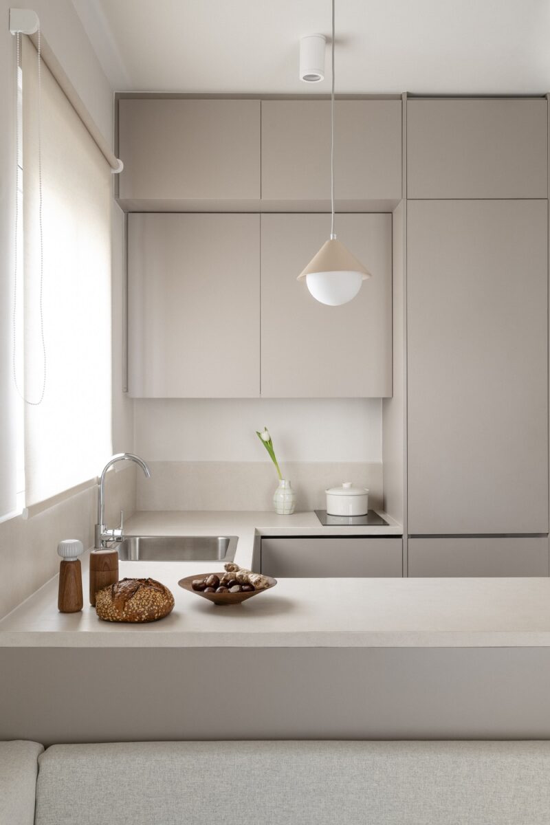 Για τον πάγκο της κουζίνας, προτιμήθηκε μπεζ κεραμικό πλακίδιο, μειώνοντας τον οπτικό θόρυβο και δίνοντας στο χώρο της κουζίνας και της τραπεζαρίας την αίσθηση ενός ενιαίου συνόλου.