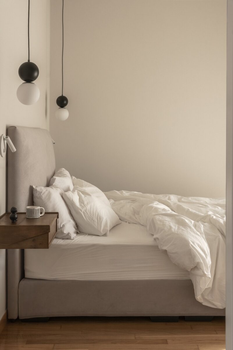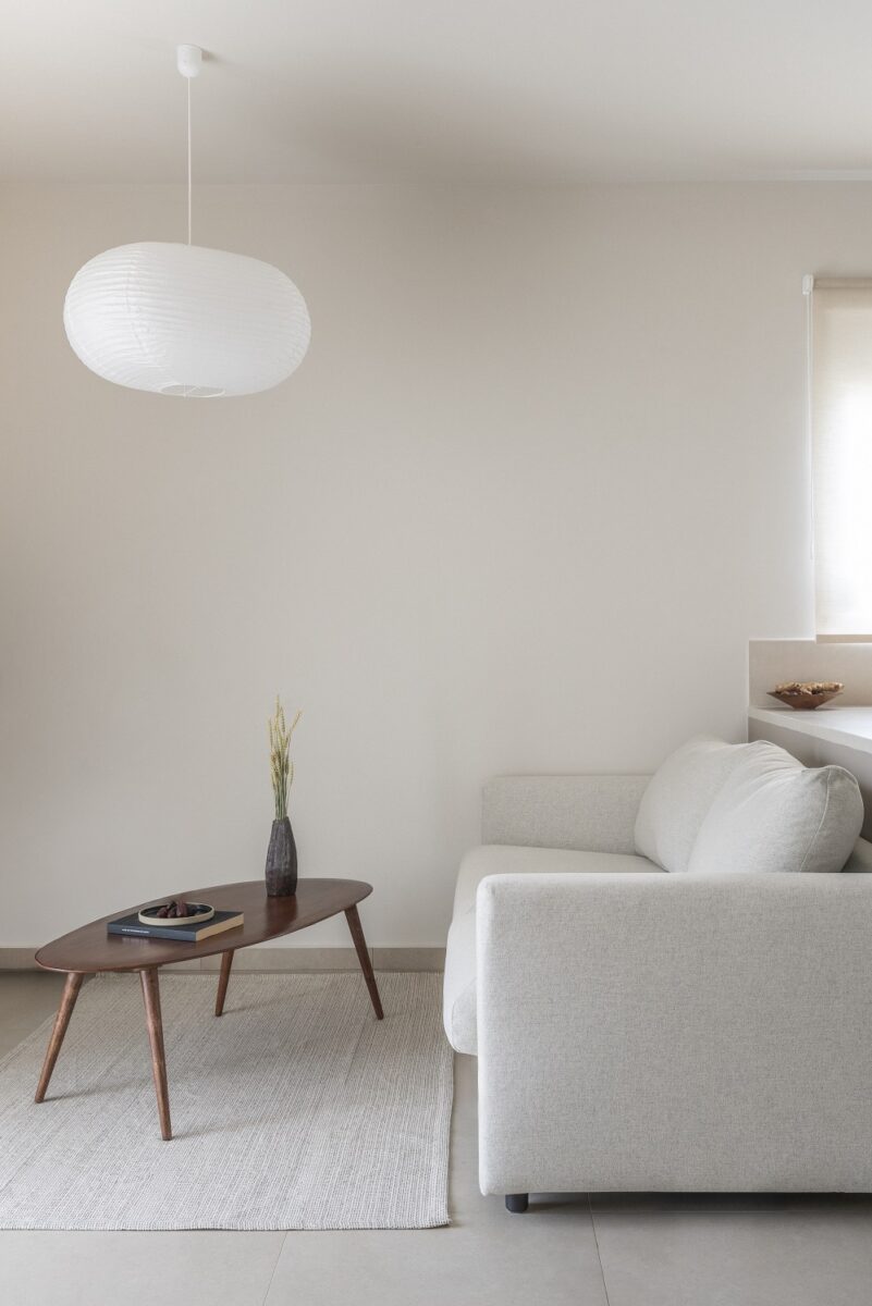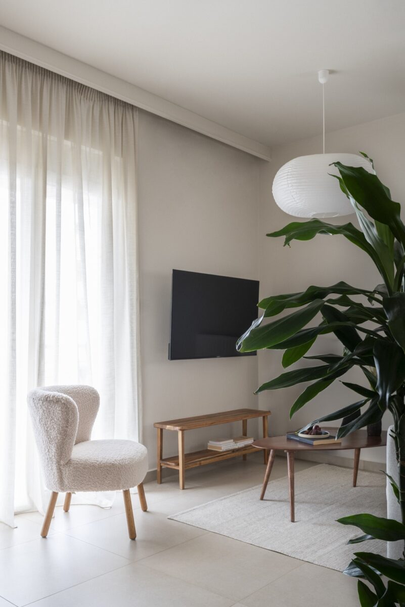 Τόνοι του μπεζ και του ξύλου συνθέτουν την ταυτότητα του διαμερίσματος σε επίπεδο υλικότητας. Λινές κουρτίνες, ένα βελούδινο κεφαλάρι, μπεζ κεραμικά πλακίδια και κεραμικά διακοσμητικά υπακούν όλα στην μονοτονική παλέτα της γαλήνης: μπεζ, λευκό και καφέ.