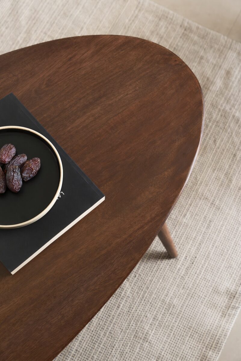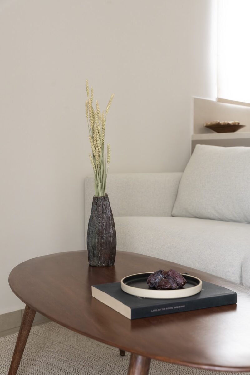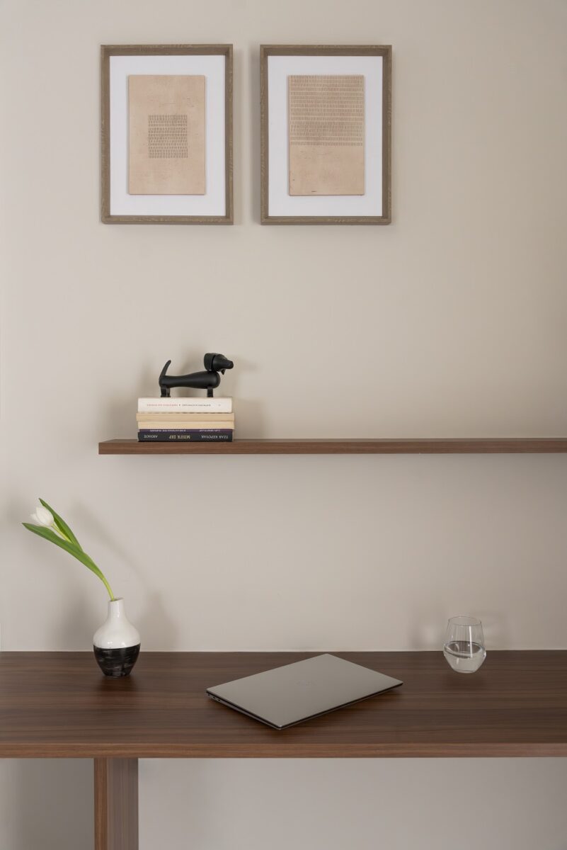Στο καθιστικό, προστίθενται ζεστές λεπτομέρειες σε ξύλο καρυδιάς και μελιάς με το coffee table και την κονσόλα τηλεόρασης. Το ίδιο υλικό επιλέχθηκε και για το custom σταθερό τραπέζι εργασίας για να ενταχθεί ομαλά στο υπόλοιπο χωρικό σύνολο, αναδεικνύοντας το concept του home-office σε ένα λειτουργικά και αισθητικά κομψό μοντέλο σχεδιασμού.