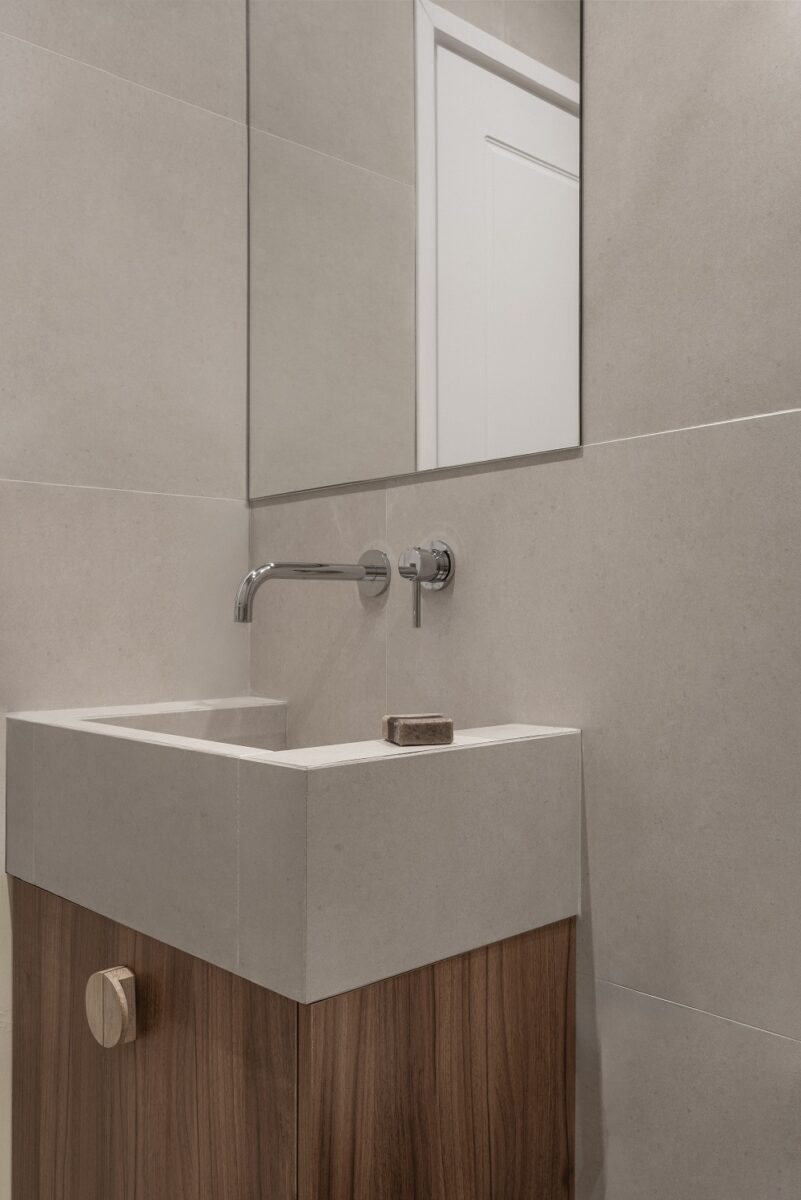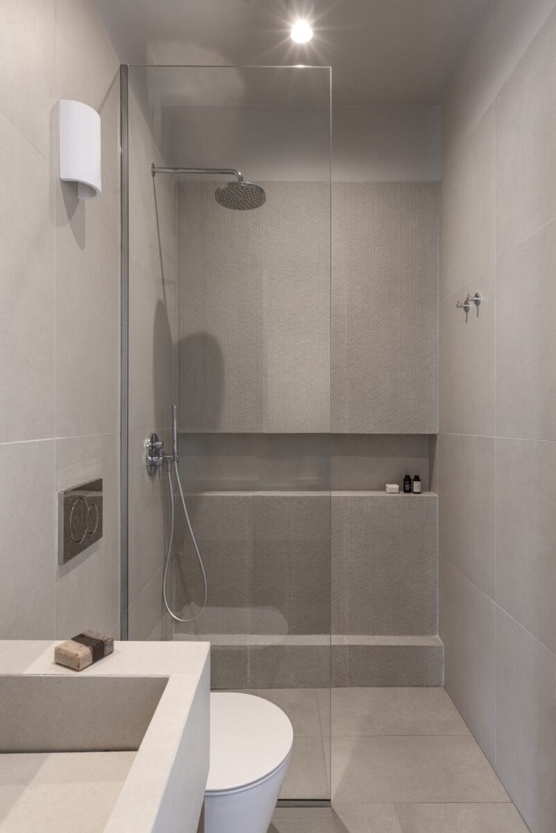 Το μπάνιο αναδιαμορφώθηκε μετακινώντας τη λεκάνη και τον νιπτήρα δίνοντας έτσι χώρο στην ντουζιέρα. Ο τοίχος της ντουζιέρας επενδύεται με κεραμικό πλακίδιο ανάγλυφης υφής, εντάσσοντας με αυτόν τον τρόπο και τη δυναμική της απτικότητας και των υφών στο έργο.