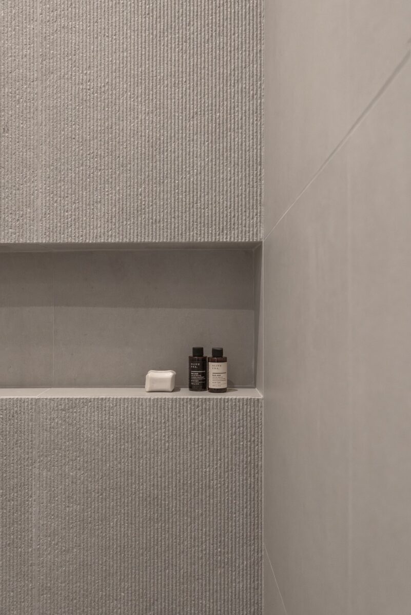 Πέρα από τη χρωματική συνέπεια, η αρχιτεκτονική ομάδα θεώρησε πως η απτική ποικιλία θα δώσει ένα επιπλέον επίπεδο ενδιαφέροντος και ποιοτήτων στο διαμέρισμα.