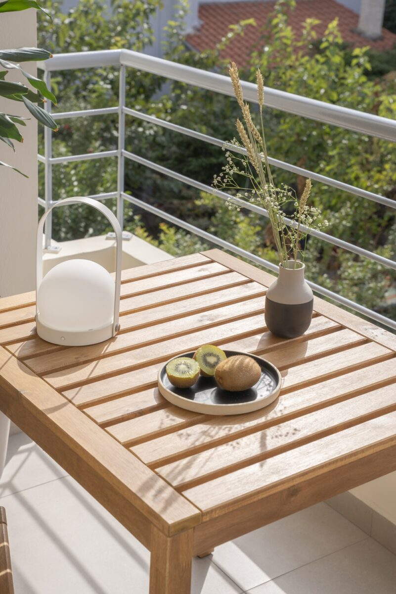Η αρχιτεκτονική ομάδα αναβίωσε και τον εξώστη τόσο με αντικατάσταση του υπάρχοντος πλακιδίου, όσο και με την τοποθέτηση γλαστρών με μεγάλο όγκο από ανακυκλωμένο υλικό της εταιρείας Ecopots, δίνοντας έτσι και μία διάσταση βιωσιμότητας στο έργο. Ένα μικρό ξύλινο τραπέζι ολοκληρώνει λειτουργικά τον εξώστη.
