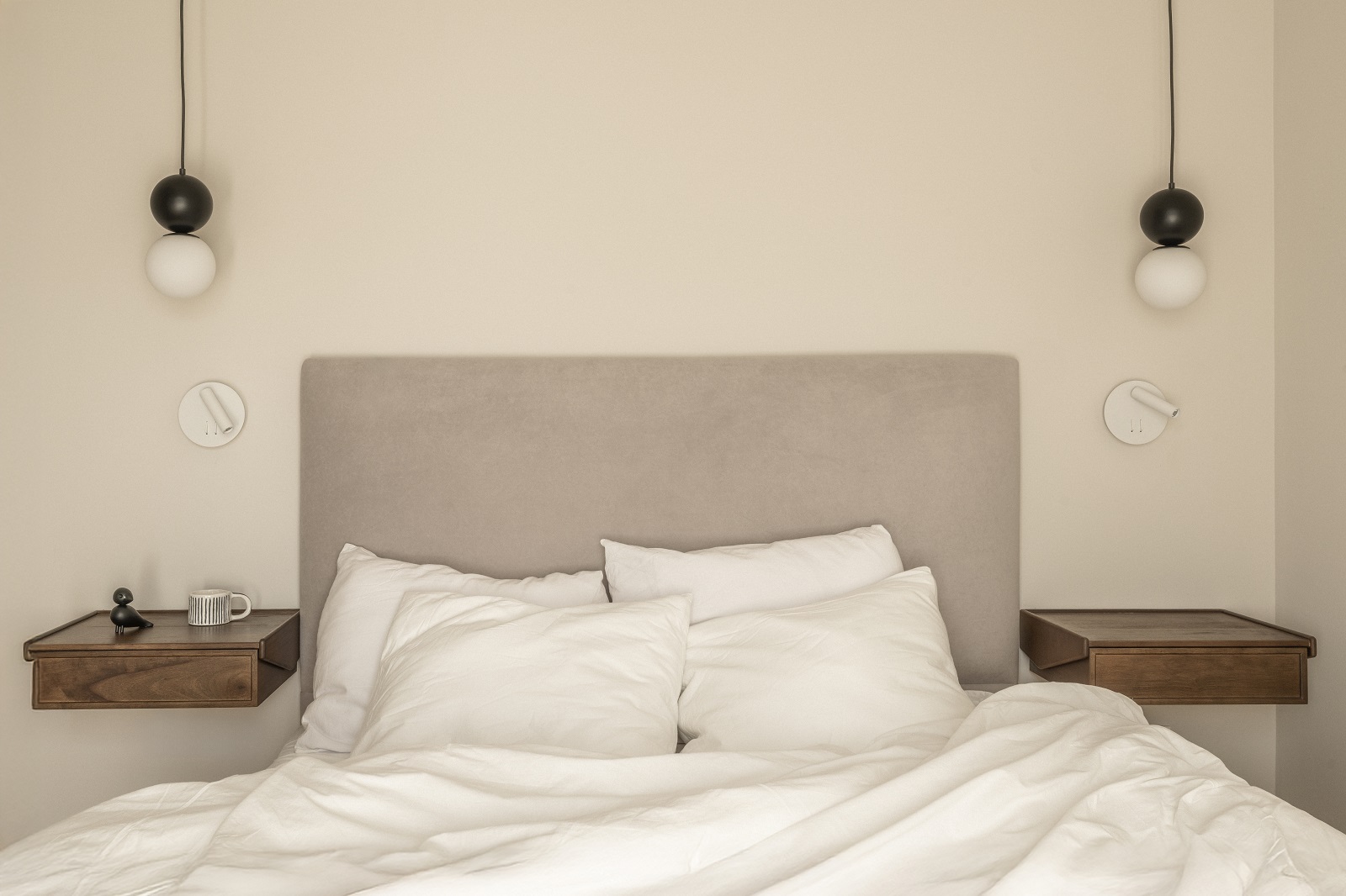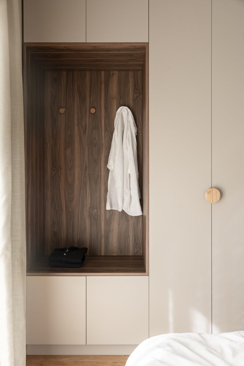 Στο υπνοδωμάτιο, η μέχρι πρότινος δυσλειτουργική ντουλάπα με μια μικρή προεξοχή λόγω της ύπαρξης υποστυλώματος στο πίσω μέρος, αντικαταστάθηκε από μια ντουλάπα με ενσωματωμένη εσοχή. Η ντουλάπα μπορεί πλέον να λειτουργήσει ως κάθισμα, ως χώρος προσωρινής αποθήκευσης βαλίτσας και για κρέμασμα ρούχων καθημερινής χρήσης, και έτσι αναδεικνύεται σε ένα πολυλειτουργικό έπιπλο.